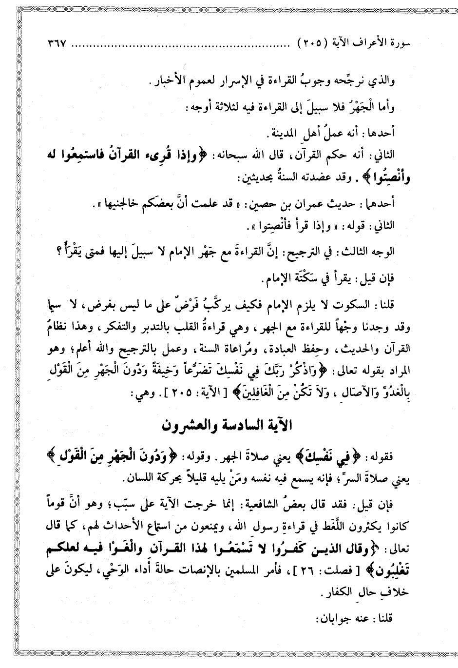 الْآيَةُ السَّادِسَةُ وَالْعِشْرُونَ فَقَوْلُهُ: {فِي نَفْسِكَ} [الأعراف: 205] يَعْنِي صَلَاةَ الْجَهْرِ. وَقَوْلُهُ: {وَدُونَ الْجَهْرِ مِنَ الْقَوْلِ} [الأعراف: 205] يَعْنِي صَلَاةَ السِّرِّ فَإِنَّهُ يَسْمَعُ فِيهِ نَفْسَهُ وَمَنْ يَلِيه قَلِيلًا بِحَرَكَةِ اللِّسَانِ.
