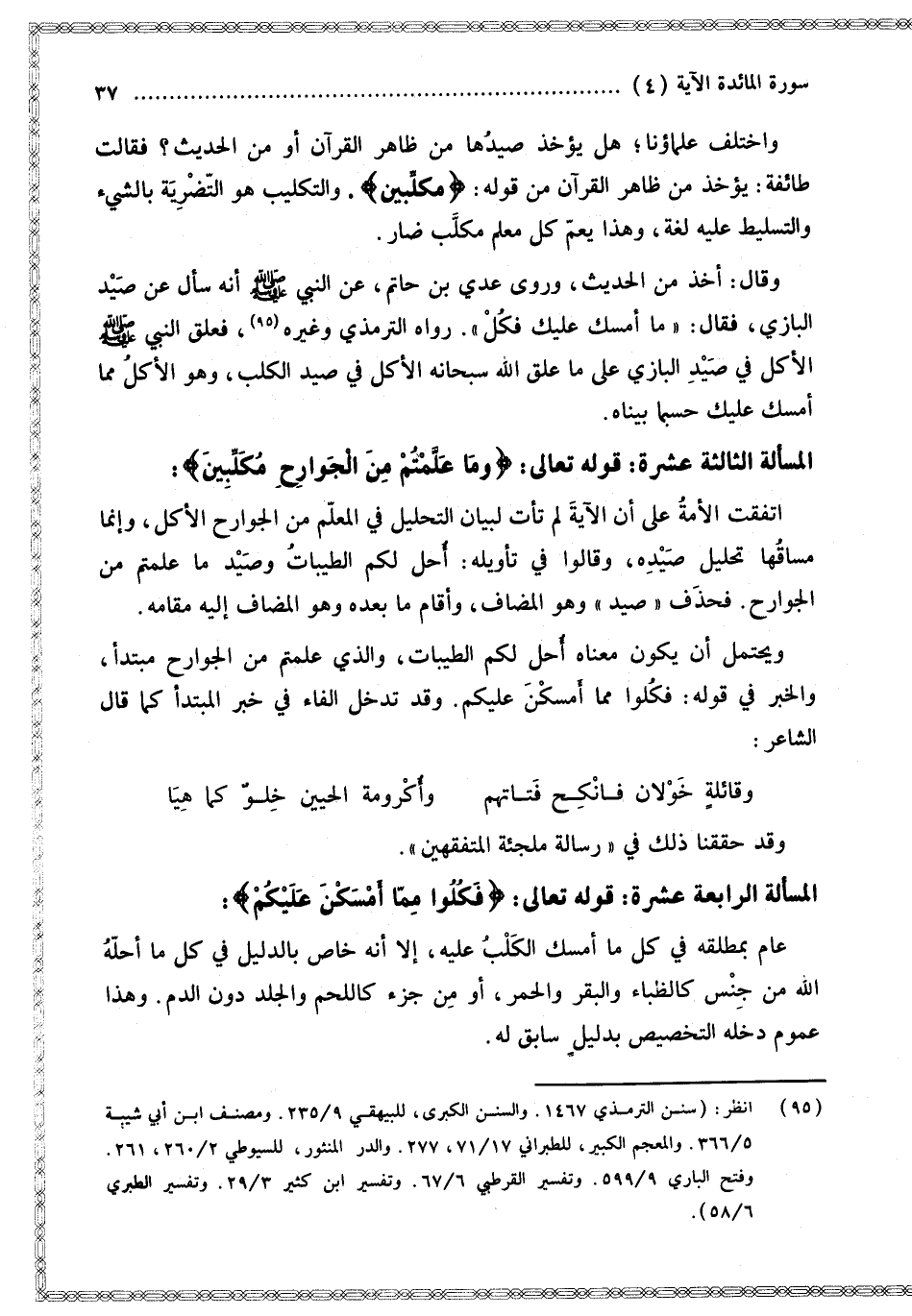 وَقَدْ حَقَّقْنَا ذَلِكَ فِي رِسَالَةِ مُلْجِئَةِ الْمُتَفَقِّهِينَ ". الْمَسْأَلَةُ الرَّابِعَةَ عَشْرَةَ: قَوْله تَعَالَى: {فَكُلُوا مِمَّا أَمْسَكْنَ عَلَيْكُمْ} [المائدة: 4] عَامٌّ بِمُطْلَقِهِ فِي كُلِّ مَا أَمْسَكَ الْكَلْبُ عَلَيْهِ، إلَّا أَنَّهُ خَاصٌّ بِالدَّلِيلِ فِي كُلِّ مَا أَحَلَّهُ اللَّهُ مِنْ جِنْسٍ كَالظِّبَاءِ وَالْبَقَرِ وَالْحُمُرِ، أَوْ مِنْ جُزْءٍ كَاللَّحْمِ وَالْجِلْدِ دُونَ الدَّمِ. وَهَذَا عُمُومٌ دَخَلَهُ التَّخْصِيصُ بِدَلِيلٍ سَابِقٍ لَهُ.