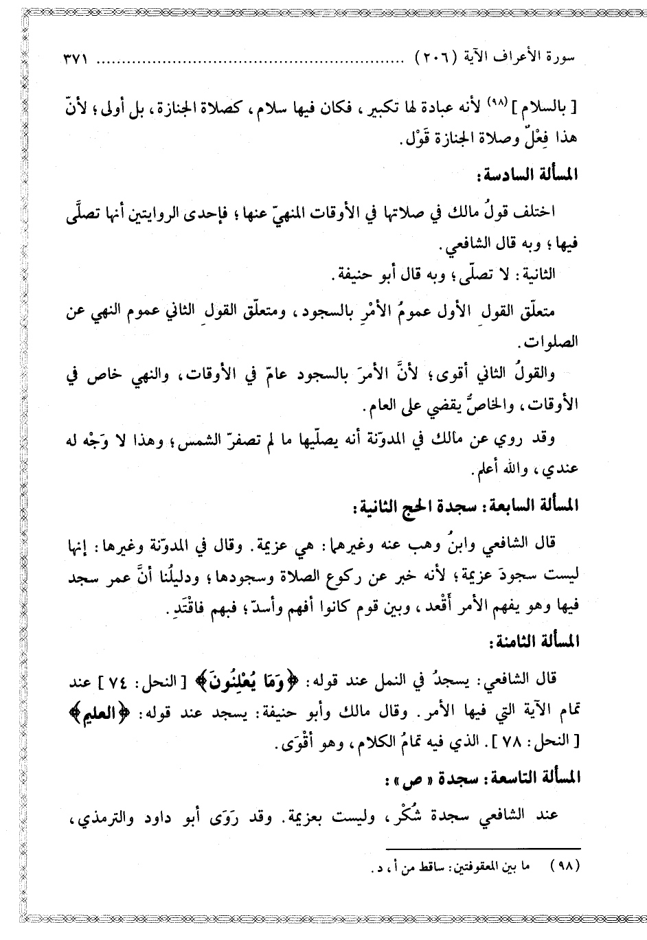 الْمَسْأَلَةُ السَّابِعَةُ: سَجْدَةُ الْحَجِّ الثَّانِيَةُ: قَالَ الشَّافِعِيُّ وَابْنُ وَهْبٍ عَنْهُ وَغَيْرُهُمَا: هِيَ عَزِيمَةٌ. وَقَالَ فِي الْمُدَوَّنَةِ وَغَيْرِهَا: إنَّهَا لَيْسَتْ سُجُودَ عَزِيمَةٍ؛ لِأَنَّهُ خَبَرٌ عَنْ رُكُوعِ الصَّلَاةِ وَسُجُودِهَا؛ وَدَلِيلُنَا أَنَّ عُمَرَ سَجَدَ فِيهَا وَهُوَ يَفْهَمُ الْأَمْرَ أَقْعَدَ، وَبَيْنَ قَوْمٍ كَانُوا أَفْهَمَ وَأَسَدَّ؛ فَبِهِمْ فَاقْتَدِ.