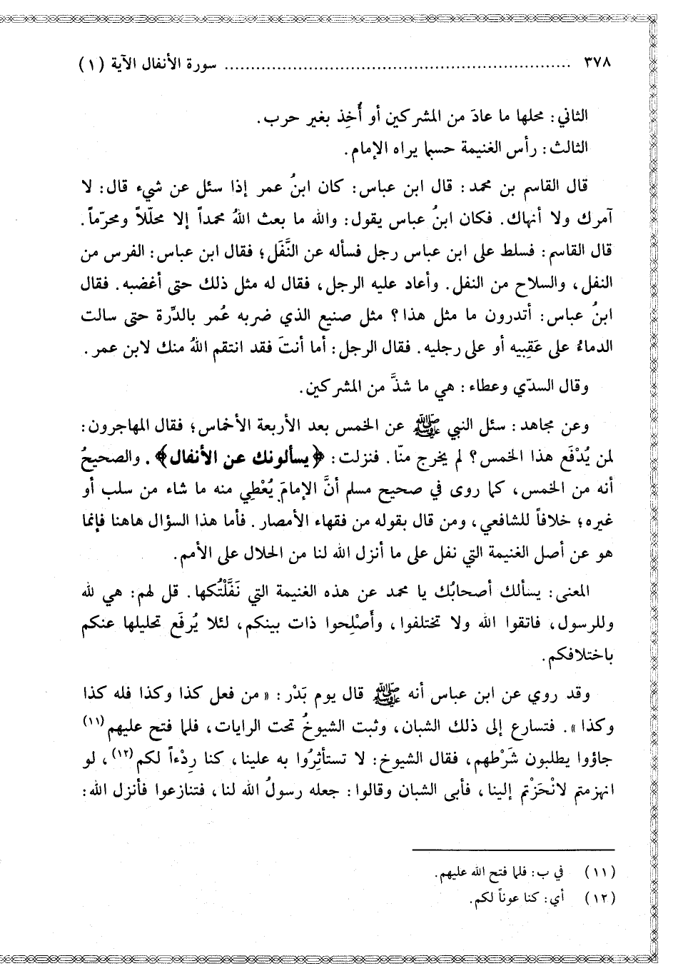 وَقَدْ رُوِيَ عَنْ «ابْنِ عَبَّاسٍ أَنَّهُ - صَلَّى اللَّهُ عَلَيْهِ وَسَلَّمَ - قَالَ يَوْمَ بَدْرٍ: مَنْ فَعَلَ كَذَا وَكَذَا فَلَهُ كَذَا وَكَذَا. فَتَسَارَعَ إلَى ذَلِكَ الشُّبَّانُ، وَثَبَتَ الشُّيُوخُ تَحْتَ الرَّايَاتِ، فَلَمَّا فُتِحَ عَلَيْهِمْ جَاءُوا يَطْلُبُونَ شَرْطَهُمْ، فَقَالَ الشُّيُوخُ: لَا تَسْتَأْثِرُوا بِهِ عَلَيْنَا، كُنَّا رِدْءًا لَكُمْ، لَوْ انْهَزَمْتُمْ لَانْحَزْتُمْ إلَيْنَا، فَأَبَى الشُّبَّانُ وَقَالُوا: جَعَلَهُ رَسُولُ اللَّهِ لَنَا، فَتَنَازَعُوا فَأَنْزَلَ اللَّهُ: