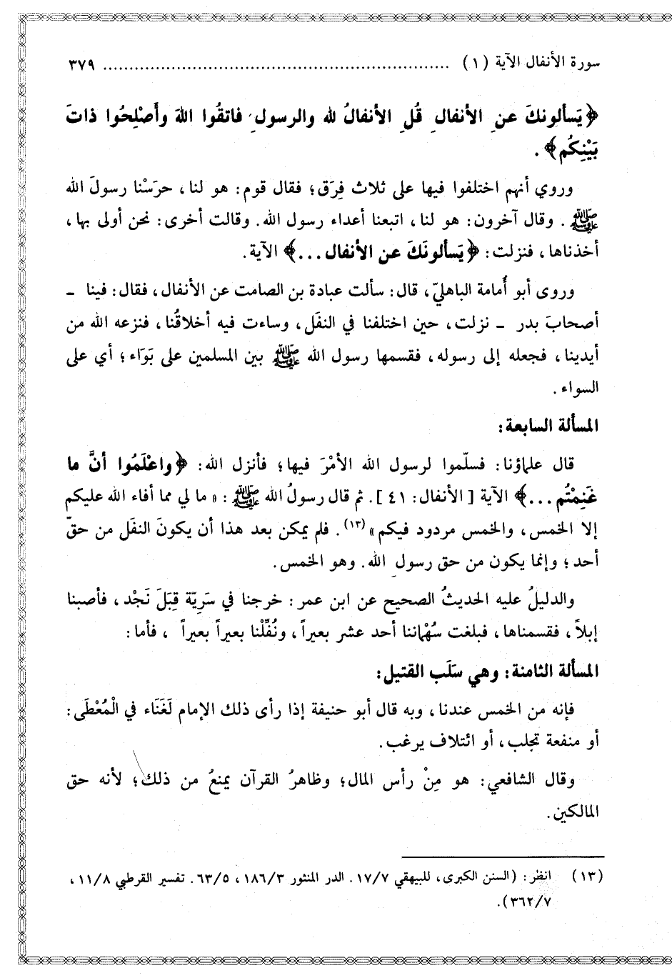 الْمَسْأَلَةُ السَّابِعَةُ: قَالَ عُلَمَاؤُنَا: «فَسَلَّمُوا لِرَسُولِ اللَّهِ الْأَمْرَ فِيهَا؛ فَأَنْزَلَ اللَّهُ: {وَاعْلَمُوا أَنَّمَا غَنِمْتُمْ} [الأنفال: 41]. ثُمَّ قَالَ رَسُولُ اللَّهِ - صَلَّى اللَّهُ عَلَيْهِ وَسَلَّمَ -: مَا لِي مِمَّا أَفَاءَ اللَّهُ عَلَيْكُمْ إلَّا الْخُمُسُ، وَالْخُمُسُ مَرْدُودٌ فِيكُمْ». فَلَمْ يُمْكِنْ بَعْدَ هَذَا أَنْ يَكُونَ النَّفَلُ مِنْ حَقِّ أَحَدٍ؛ وَإِنَّمَا يَكُونُ مِنْ حَقِّ رَسُولِ اللَّهِ. وَهُوَ الْخُمُسُ.