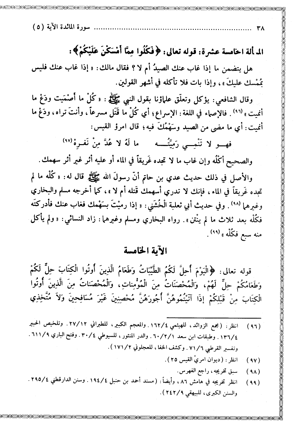 [الْآيَة الْخَامِسَة قَوْله تَعَالَى الْيَوْمَ أُحِلَّ لَكُمْ الطَّيِّبَاتُ وَطَعَامُ الَّذِينَ أُوتُوا الْكِتَابَ حِلٌّ لَكُمْ]