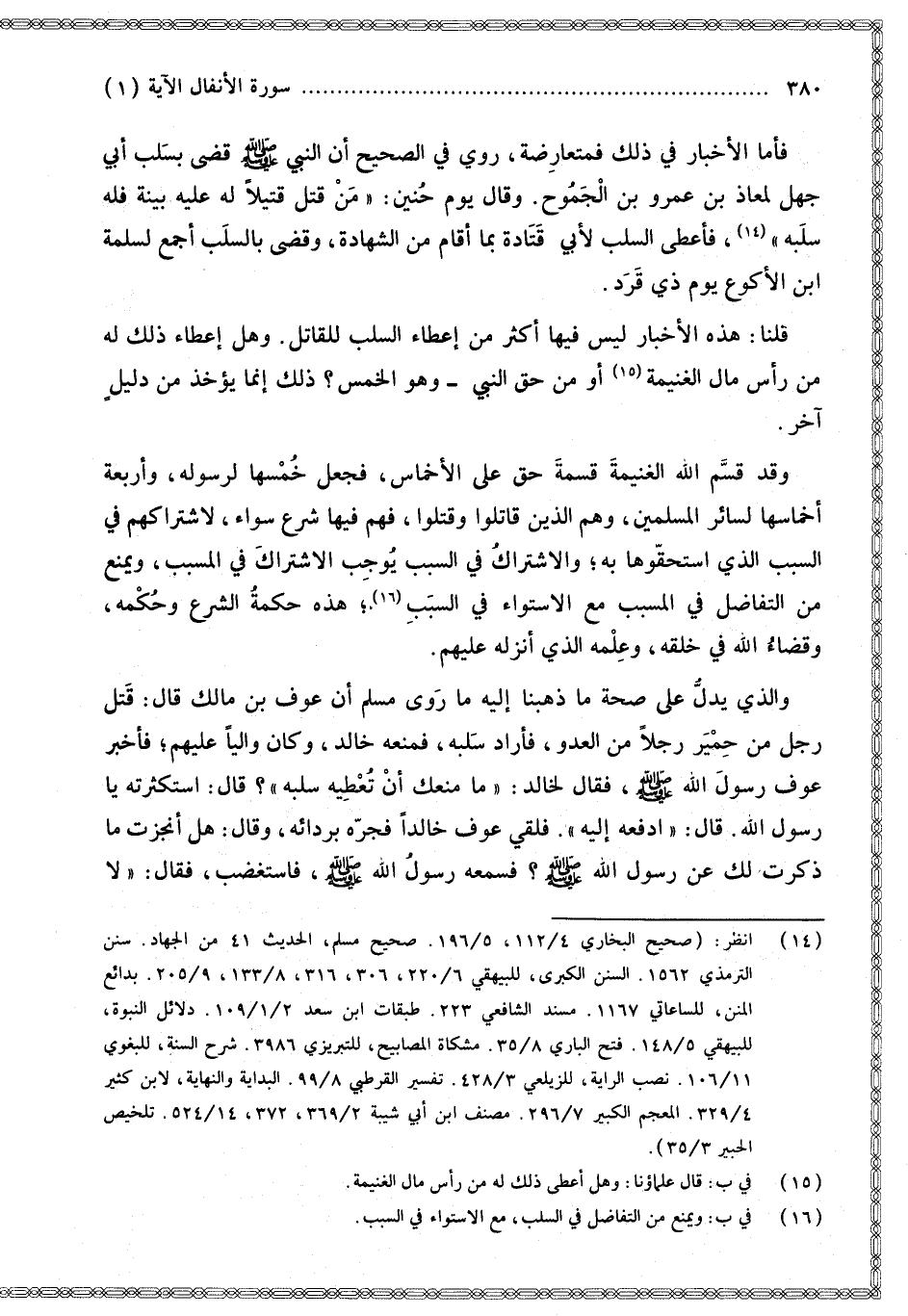 فَأَمَّا الْأَخْبَارُ فِي ذَلِكَ فَمُتَعَارِضَةٌ، رُوِيَ فِي الصَّحِيحِ أَنَّ «النَّبِيَّ - صَلَّى اللَّهُ عَلَيْهِ وَسَلَّمَ - قَضَى بِسَلَبِ أَبِي جَهْلٍ لِمُعَاذِ بْنِ عَمْرِو بْنِ الْجَمُوحِ». وَقَالَ يَوْمَ حُنَيْنٍ: «مَنْ قَتَلَ قَتِيلًا لَهُ عَلَيْهِ بَيِّنَةٌ فَلَهُ سَلَبُهُ، فَأَعْطَى السَّلَبَ لِأَبِي قَتَادَةَ بِمَا أَقَامَ مِنْ الشَّهَادَةِ، وَقَضَى بِالسَّلَبِ أَجْمَعَ لِسَلَمَةَ بْنِ الْأَكْوَعِ يَوْمَ ذِي قَرَدٍ».