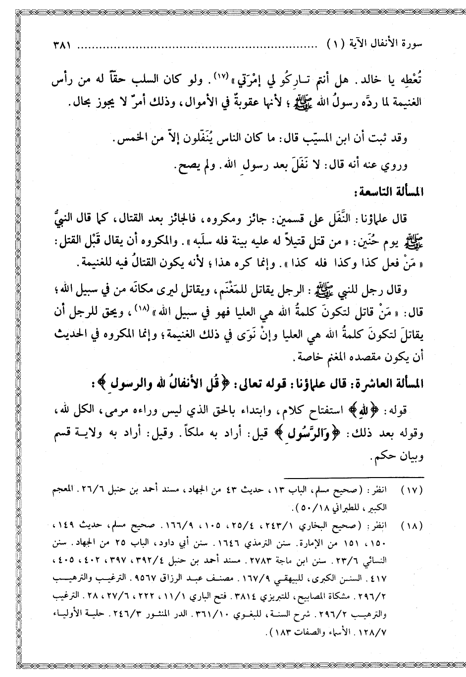 الْمَسْأَلَةُ التَّاسِعَةُ: قَالَ عُلَمَاؤُنَا: النَّفَلُ عَلَى قِسْمَيْنِ: جَائِزٌ وَمَكْرُوهٌ، فَالْجَائِزُ بَعْدَ الْقِتَالِ، كَمَا قَالَ النَّبِيُّ - صَلَّى اللَّهُ عَلَيْهِ وَسَلَّمَ - يَوْمَ حُنَيْنٍ: «مَنْ قَتَلَ قَتِيلًا لَهُ عَلَيْهِ بَيِّنَةٌ فَلَهُ سَلَبُهُ». وَالْمَكْرُوهُ أَنْ يُقَالَ قَبْلَ الْقَتْلِ: " مَنْ فَعَلَ كَذَا وَكَذَا فَلَهُ كَذَا ". وَإِنَّمَا كُرِهَ هَذَا؛ لِأَنَّهُ يَكُونُ الْقِتَالُ فِيهِ لِلْغَنِيمَةِ.