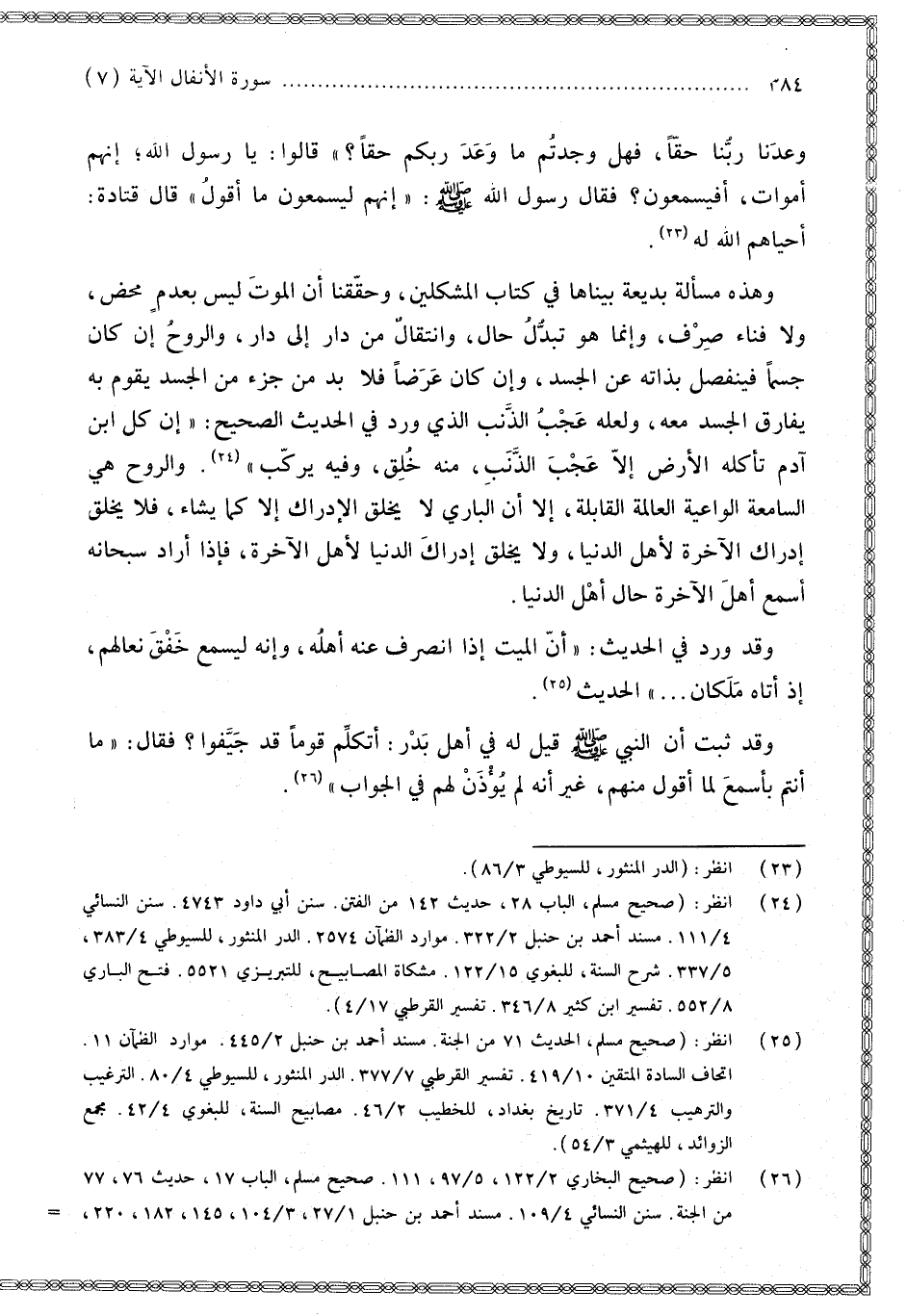 وَقَدْ ثَبَتَ أَنَّ «النَّبِيَّ - صَلَّى اللَّهُ عَلَيْهِ وَسَلَّمَ - قِيلَ لَهُ فِي أَهْلِ بَدْرٍ: أَتُكَلِّمُ قَوْمًا قَدْ جَيَّفُوا؟ فَقَالَ: مَا أَنْتُمْ بِأَسْمَعَ لِمَا أَقُولُ مِنْهُمْ، غَيْرَ أَنَّهُ لَمْ يُؤْذَنْ لَهُمْ فِي الْجَوَابِ»