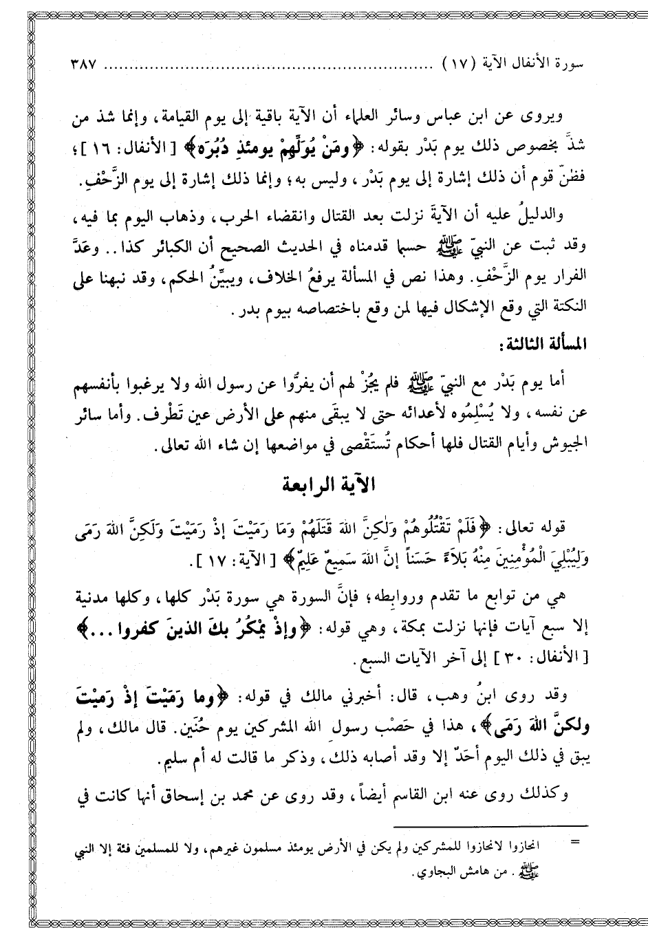 الْمَسْأَلَةُ الثَّالِثَةُ: أَمَّا يَوْمُ بَدْرٍ مَعَ النَّبِيِّ - صَلَّى اللَّهُ عَلَيْهِ وَسَلَّمَ - فَلَمْ يَجُزْ لَهُمْ أَنْ يَفِرُّوا عَنْ رَسُولِ اللَّهِ وَلَا يَرْغَبُوا بِأَنْفُسِهِمْ عَنْ نَفْسِهِ، وَلَا يُسْلِمُوهُ لِأَعْدَائِهِ حَتَّى لَا يَبْقَى مِنْهُمْ عَلَى الْأَرْضِ عَيْنٌ تُطْرَفُ. وَأَمَّا سَائِرُ الْجُيُوشِ وَأَيَّامُ الْقِتَالِ فَلَهَا أَحْكَامٌ تُسْتَقْصَى فِي مَوَاضِعِهَا إنْ شَاءَ اللَّهُ تَعَالَى.