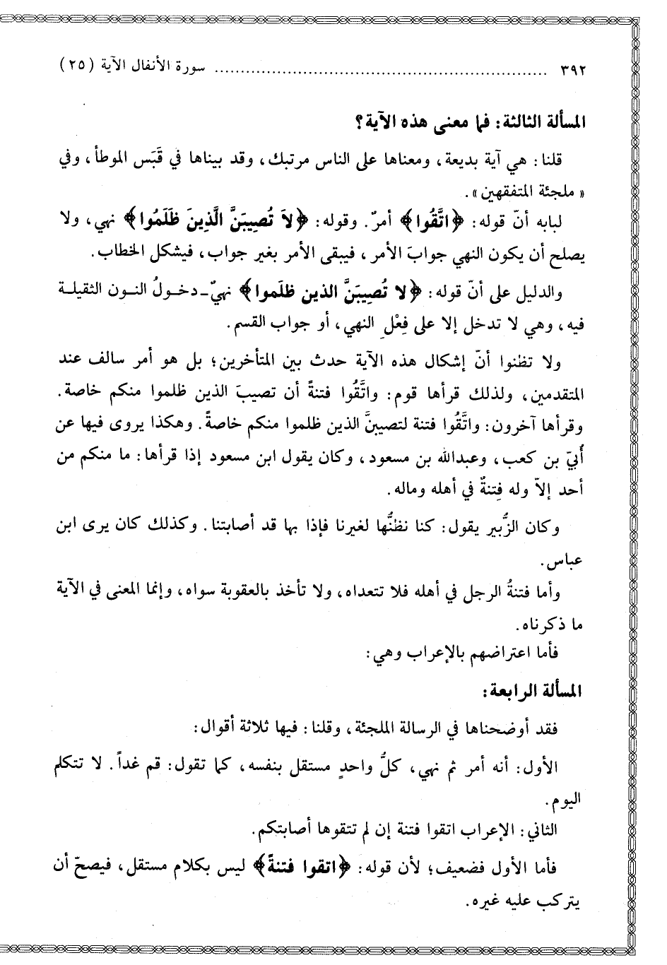 وَقَوْلُهُ: {لا تُصِيبَنَّ الَّذِينَ ظَلَمُوا} [الأنفال: 25] نَهْيٌ، وَلَا يَصْلُحُ أَنْ يَكُونَ النَّهْيُ جَوَابَ الْأَمْرِ، فَيَبْقَى الْأَمْرُ بِغَيْرِ جَوَابٍ، فَيُشْكِلُ الْخِطَابُ.