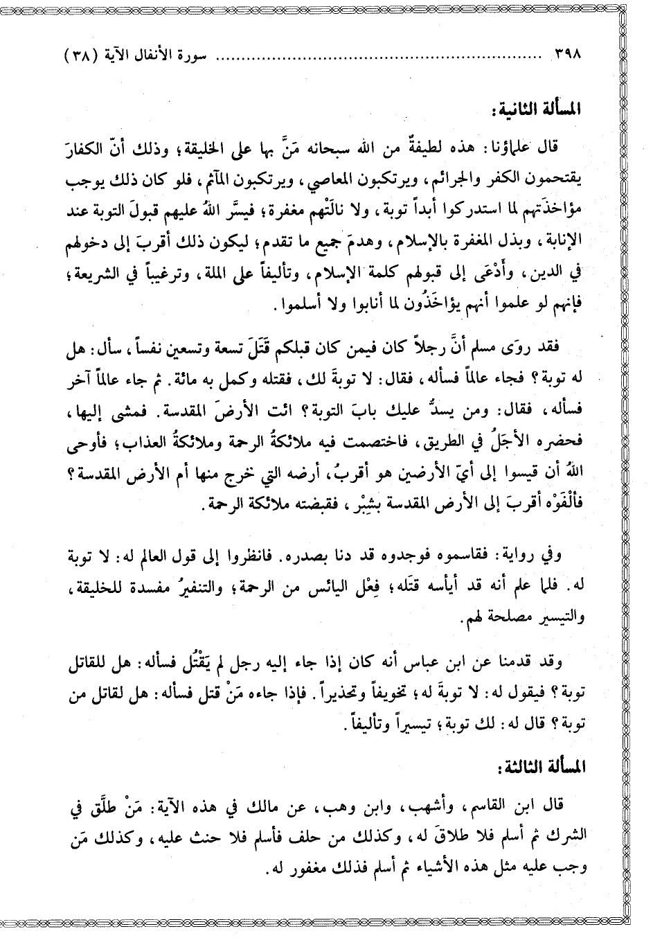 الْمَسْأَلَةُ الثَّانِيَةُ: قَالَ عُلَمَاؤُنَا: هَذِهِ لَطِيفَةٌ مِنْ اللَّهِ سُبْحَانَهُ مَنَّ بِهَا عَلَى الْخَلِيقَةِ؛ وَذَلِكَ أَنَّ الْكُفَّارَ يَقْتَحِمُونَ الْكُفْرَ وَالْجَرَائِمَ، وَيَرْتَكِبُونَ الْمَعَاصِيَ، وَيَرْتَكِبُونَ الْمَآثِمَ، فَلَوْ كَانَ ذَلِكَ يُوجِبُ مُؤَاخَذَتَهُمْ لَمَا اسْتَدْرَكُوا أَبَدًا تَوْبَةً، وَلَا نَالَتْهُمْ مَغْفِرَةٌ؛ فَيَسَّرَ اللَّهُ عَلَيْهِمْ قَبُولَ التَّوْبَةِ عِنْدَ الْإِنَابَةِ، وَبَذَلَ الْمَغْفِرَةَ بِالْإِسْلَامِ، وَهَدَمَ جَمِيعَ مَا تَقَدَّمَ؛ لِيَكُونَ ذَلِكَ أَقْرَبَ إلَى دُخُولِهِمْ فِي الدِّينِ، وَأَدْعَى إلَى قَبُولِهِمْ كَلِمَةَ الْإِسْلَامِ، وَتَأْلِيفًا عَلَى الْمِلَّةِ، وَتَرْغِيبًا فِي الشَّرِيعَةِ؛ فَإِنَّهُمْ لَوْ عَلِمُوا أَنَّهُمْ يُؤَاخَذُونَ لَمَا أَنَابُوا وَلَا أَسْلَمُوا.