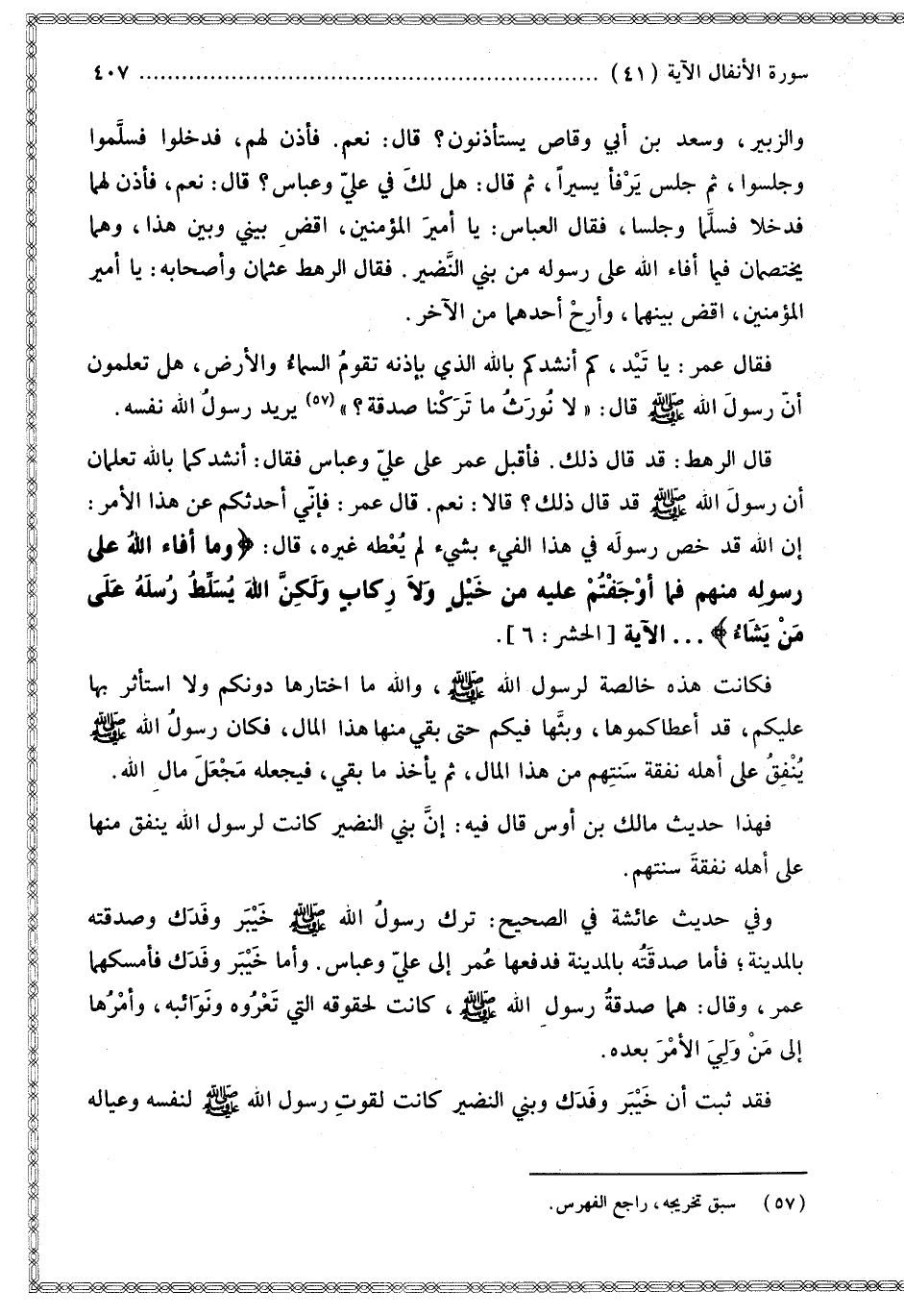 وَالزُّبَيْرِ، وَسَعْدِ بْنِ أَبِي وَقَّاصٍ يَسْتَأْذِنُونَ؟ قَالَ: نَعَمْ. فَأَذِنَ لَهُمْ، فَدَخَلُوا فَسَلَّمُوا وَجَلَسُوا، ثُمَّ جَلَسَ يَرْفَأُ يَسِيرًا، ثُمَّ قَالَ: هَلْ لَكَ فِي عَلِيٍّ وَعَبَّاسٍ؟ قَالَ: نَعَمْ، فَأَذِنَ لَهُمَا فَدَخَلَا فَسَلَّمَا وَجَلَسَا، فَقَالَ الْعَبَّاسُ: يَا أَمِيرَ الْمُؤْمِنِينَ، اقْضِ بَيْنِي وَبَيْنَ هَذَا، وَهُمَا يَخْتَصِمَانِ فِيمَا أَفَاءَ اللَّهُ عَلَى رَسُولِهِ مِنْ بَنِي النَّضِيرِ. فَقَالَ الرَّهْطُ عُثْمَانُ وَأَصْحَابُهُ: يَا أَمِيرَ الْمُؤْمِنِينَ، اقْضِ بَيْنَهُمَا، وَأَرِحْ أَحَدَهُمَا مِنْ الْآخَرِ. فَقَالَ عُمَرُ: يَا تُيَّدُ، كَمْ أَنْشُدُكُمْ بِاَللَّهِ الَّذِي بِإِذْنِهِ تَقُومُ السَّمَاءُ وَالْأَرْضُ، هَلْ تَعْلَمُونَ أَنَّ رَسُولَ اللَّهِ - صَلَّى اللَّهُ عَلَيْهِ وَسَلَّمَ - قَالَ: «لَا نُورَثُ مَا تَرَكْنَا صَدَقَةٌ؟» يُرِيدُ رَسُولُ اللَّهِ نَفْسَهُ. قَالَ الرَّهْطُ: قَدْ قَالَ ذَلِكَ. فَأَقْبَلَ عُمَرُ عَلَى عَلِيٍّ وَعَبَّاسٍ فَقَالَ: أَنْشُدُكُمَا بِاَللَّهِ تَعْلَمَانِ أَنَّ رَسُولَ اللَّهِ - صَلَّى اللَّهُ عَلَيْهِ وَسَلَّمَ - قَدْ قَالَ ذَلِكَ؟ قَالَا: نَعَمْ. قَالَ عُمَرُ: فَإِنِّي أُحَدِّثُكُمْ عَنْ هَذَا الْأَمْرِ: إنَّ اللَّهَ قَدْ خَصَّ رَسُولَهُ فِي هَذَا الْفَيْءِ بِشَيْءٍ لَمْ يُعْطِهِ غَيْرَهُ، قَالَ: {وَمَا أَفَاءَ اللَّهُ عَلَى رَسُولِهِ مِنْهُمْ فَمَا أَوْجَفْتُمْ عَلَيْهِ مِنْ خَيْلٍ وَلا رِكَابٍ وَلَكِنَّ اللَّهَ يُسَلِّطُ رُسُلَهُ عَلَى مَنْ يَشَاءُ} [الحشر: 6]. فَكَانَتْ هَذِهِ خَالِصَةً لِرَسُولِ اللَّهِ - صَلَّى اللَّهُ عَلَيْهِ وَسَلَّمَ -: وَاَللَّهِ مَا اخْتَارَهَا دُونَكُمْ، وَلَا اسْتَأْثَرَ بِهَا عَلَيْكُمْ، قَدْ أَعْطَاكُمُوهَا، وَبَثَّهَا فِيكُمْ حَتَّى بَقِيَ مِنْهَا هَذَا الْمَالُ، فَكَانَ رَسُولُ اللَّهِ - صَلَّى اللَّهُ عَلَيْهِ وَسَلَّمَ - يُنْفِقُ عَلَى أَهْلِهِ نَفَقَةَ سَنَتِهِمْ مِنْ هَذَا الْمَالِ، ثُمَّ يَأْخُذُ مَا بَقِيَ، فَيَجْعَلُهُ مَجْعَلَ مَالِ اللَّهِ.