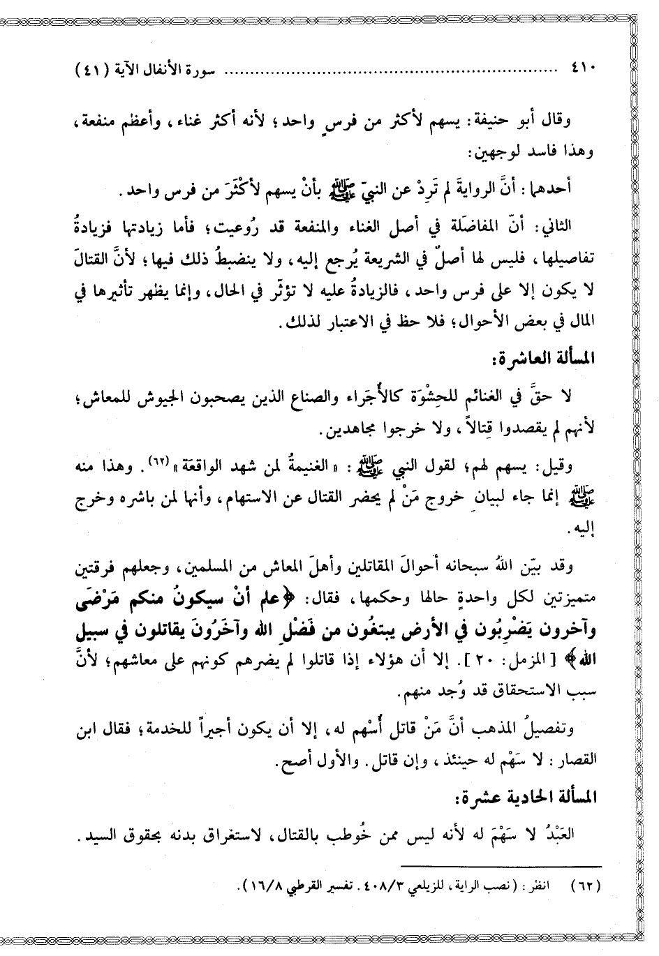الْمَسْأَلَةُ الْعَاشِرَةُ: لَا حَقَّ فِي الْغَنَائِمِ لِلْحَشْوَةِ كَالْأُجَرَاءِ وَالصُّنَّاعِ الَّذِينَ يَصْحَبُونَ الْجُيُوشَ لِلْمَعَاشِ؛ لِأَنَّهُمْ لَمْ يَقْصِدُوا قِتَالًا، وَلَا خَرَجُوا مُجَاهِدِينَ.