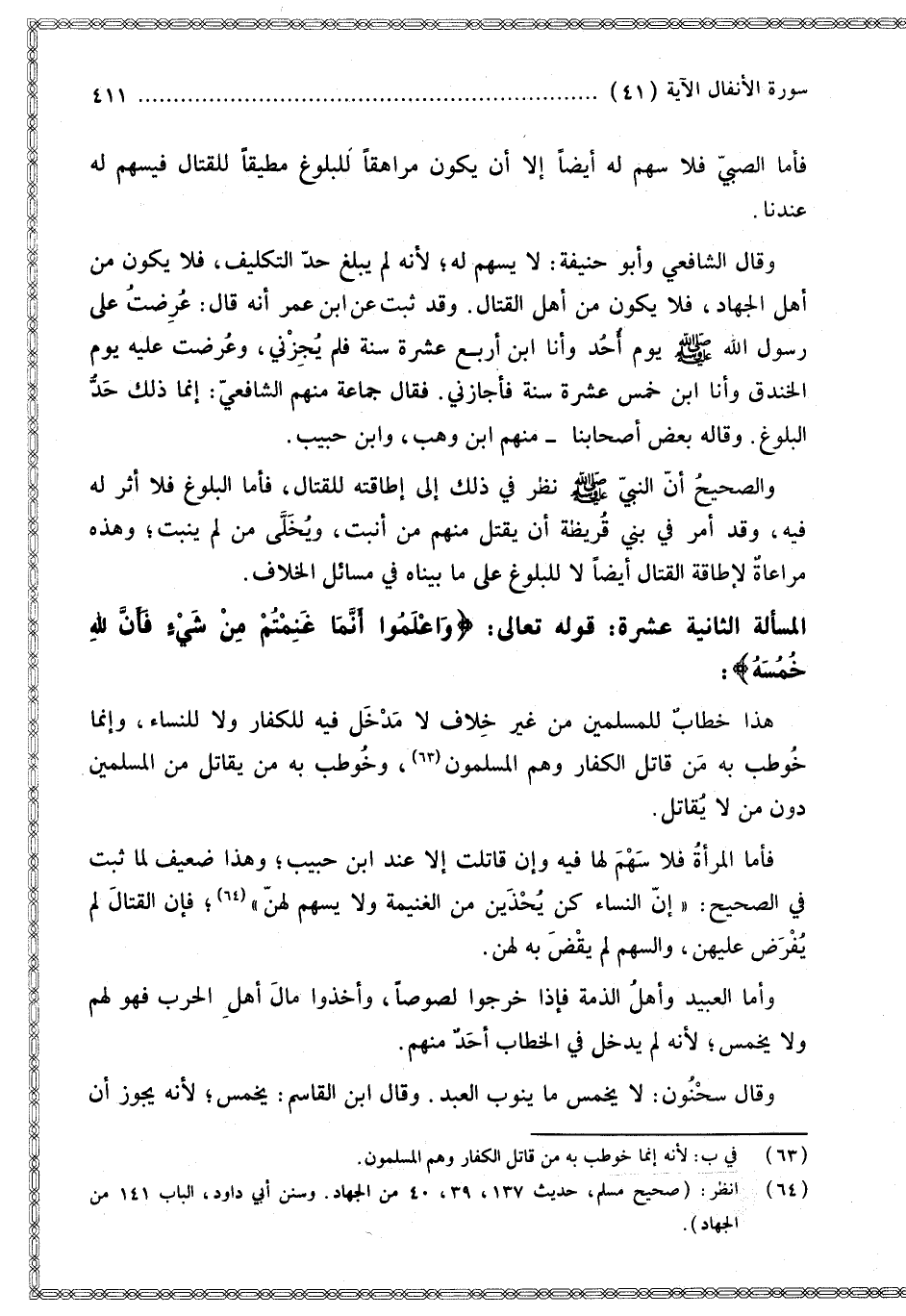 الْمَسْأَلَةُ الثَّانِيَةَ عَشْرَةَ: قَوْله تَعَالَى: {وَاعْلَمُوا أَنَّمَا غَنِمْتُمْ مِنْ شَيْءٍ فَأَنَّ لِلَّهِ خُمُسَهُ} [الأنفال: 41] هَذَا خِطَابٌ لِلْمُسْلِمِينَ مِنْ غَيْرِ خِلَافٍ لَا مَدْخَلَ فِيهِ لِلْكُفَّارِ وَلَا لِلنِّسَاءِ، وَإِنَّمَا خُوطِبَ بِهِ مَنْ قَاتَلَ الْكُفَّارَ وَهُمْ الْمُسْلِمُونَ، وَخُوطِبَ بِهِ مَنْ يُقَاتِلُ مِنْ الْمُسْلِمِينَ دُونَ مَنْ لَا يُقَاتِلُ.