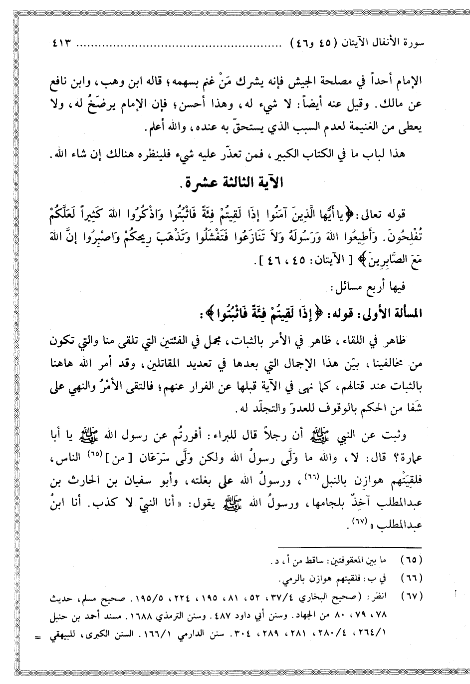 الْمَسْأَلَةُ الْأُولَى: قَوْلُهُ: {إِذَا لَقِيتُمْ فِئَةً فَاثْبُتُوا} [الأنفال: 45] ظَاهِرٌ فِي اللِّقَاءِ، ظَاهِرٌ فِي الْأَمْرِ بِالثَّبَاتِ، مُجْمَلٌ فِي الْفِئَتَيْنِ الَّتِي تُلْقَى مِنَّا وَاَلَّتِي تَكُونُ مِنْ مُخَالِفِينَا، بَيَّنَ هَذَا الْإِجْمَالَ الَّتِي بَعْدَهَا فِي تَعْدِيدِ الْمُقَاتِلِينَ، وَقَدْ أَمَرَ اللَّهُ هَاهُنَا بِالثَّبَاتِ عِنْدَ قِتَالِهِمْ، كَمَا نَهَى فِي الْآيَةِ قَبْلَهَا عَنْ الْفِرَارِ عَنْهُمْ؛ فَالْتَقَى الْأَمْرُ وَالنَّهْيُ عَلَى شَفَا مِنْ الْحُكْمِ بِالْوُقُوفِ لِلْعَدُوِّ وَالتَّجَلُّدِ لَهُ.