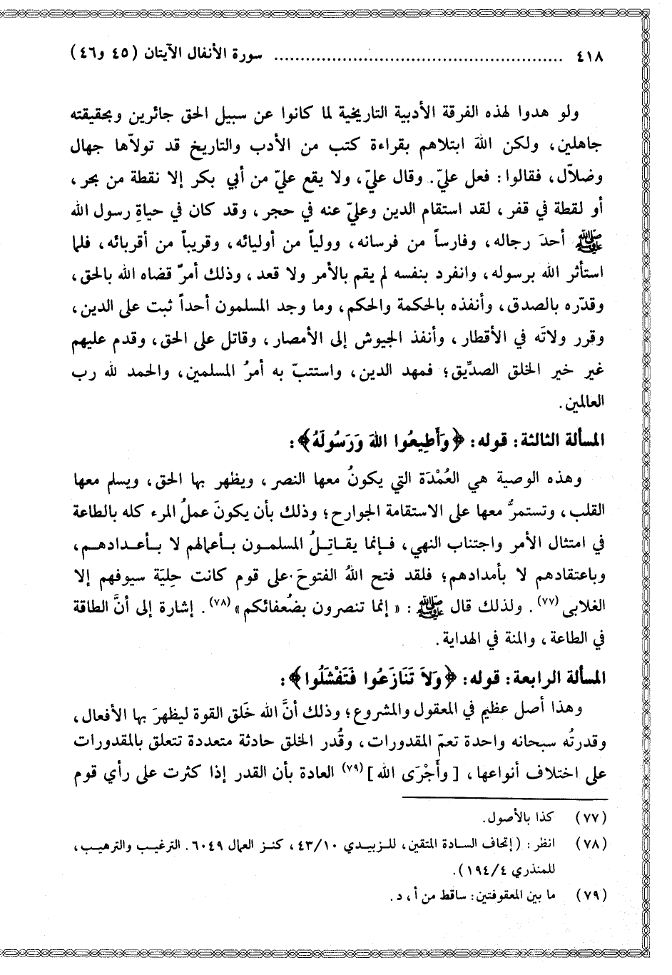 الْمَسْأَلَةُ الثَّالِثَةُ: قَوْلُهُ: {وَأَطِيعُوا اللَّهَ وَرَسُولَهُ} [الأنفال: 46] وَهَذِهِ الْوَصِيَّةُ هِيَ الْعُمْدَةُ الَّتِي يَكُونُ مَعَهَا النَّصْرُ، وَيَظْهَرُ بِهَا الْحَقُّ، وَيُسْلِمُ مَعَهَا الْقَلْبُ، وَتَسْتَمِرُّ مَعَهَا عَلَى الِاسْتِقَامَةِ الْجَوَارِحُ؛ وَذَلِكَ بِأَنْ يَكُونَ عَمَلُ الْمَرْءِ كُلُّهُ بِالطَّاعَةِ فِي امْتِثَالِ الْأَمْرِ وَاجْتِنَابِ النَّهْيِ، فَإِنَّمَا يُقَاتِلُ الْمُسْلِمُونَ بِأَعْمَالِهِمْ لَا بِأَعْدَادِهِمْ، وَبِاعْتِقَادِهِمْ لَا بِأَمْدَادِهِمْ؛ فَلَقَدْ فَتَحَ اللَّهُ الْفُتُوحَ عَلَى قَوْمٍ كَانَتْ حِلْيَةُ سُيُوفِهِمْ إلَّا الْغَلَّابِيّ.
