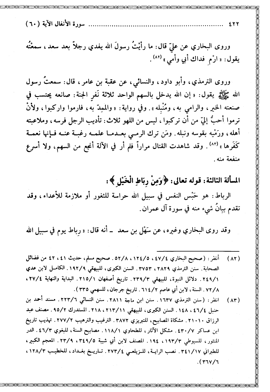 وَرَوَى التِّرْمِذِيُّ، وَأَبُو دَاوُد، وَالنَّسَائِيُّ، عَنْ عُقْبَةَ بْنِ عَامِرٍ قَالَ: سَمِعْت رَسُولَ اللَّهِ - صَلَّى اللَّهُ عَلَيْهِ وَسَلَّمَ - يَقُولُ: «إنَّ اللَّهَ يُدْخِلُ بِالسَّهْمِ الْوَاحِدِ ثَلَاثَةَ نَفَرٍ الْجَنَّةَ: صَانِعُهُ يَحْتَسِبُ فِي صَنْعَتِهِ الْخَيْرَ، وَالرَّامِي بِهِ، وَمُنْبِلُهُ». وَفِي رِوَايَةٍ: «وَالْمُمِدُّ بِهِ، فَارْمُوا وَارْكَبُوا، وَلَأَنْ تَرْمُوا أَحَبُّ إلَيَّ مِنْ أَنْ تَرْكَبُوا، لَيْسَ مِنْ اللَّهْوِ ثَلَاثٌ: تَأْدِيبُ الرَّجُلِ فَرَسَهُ، وَمُلَاعَبَتُهُ أَهْلَهُ، وَرَمْيُهُ بِقَوْسِهِ وَنَبْلِهِ. وَمَنْ تَرَكَ الرَّمْيَ بَعْدَمَا عَلِمَهُ رَغْبَةً عَنْهُ فَإِنَّهَا نِعْمَةٌ كَفَرَهَا».