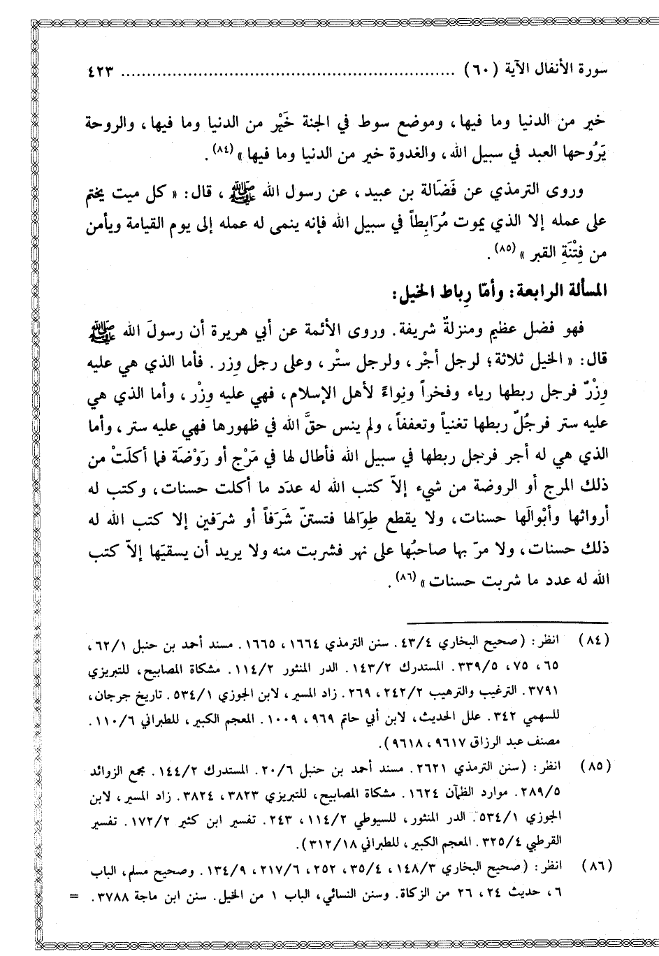الْمَسْأَلَةُ الرَّابِعَةُ: وَأَمَّا رِبَاطُ الْخَيْلِ: فَهُوَ فَضْلٌ عَظِيمٌ وَمَنْزِلَةٌ شَرِيفَةٌ.
