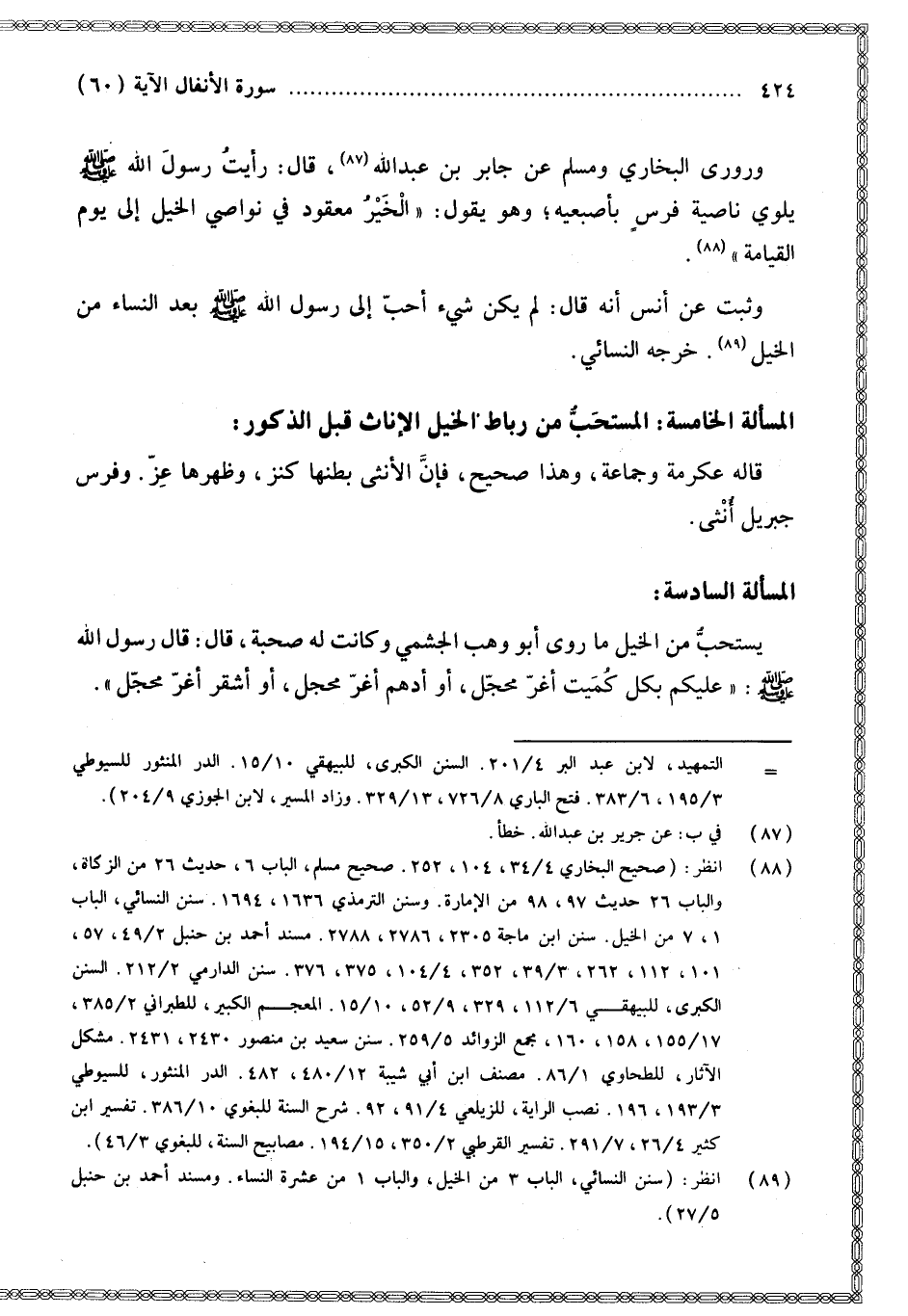 وَرَوَى الْبُخَارِيُّ وَمُسْلِمٌ عَنْ «جَابِرِ بْنِ عَبْدِ اللَّهِ قَالَ: رَأَيْت رَسُولَ اللَّهِ - صَلَّى اللَّهُ عَلَيْهِ وَسَلَّمَ - يَلْوِي نَاصِيَةَ فَرَسٍ بِأُصْبُعَيْهِ؛ وَهُوَ يَقُولُ: الْخَيْرُ مَعْقُودٌ فِي نَوَاصِي الْخَيْلِ إلَى يَوْمِ الْقِيَامَةِ».