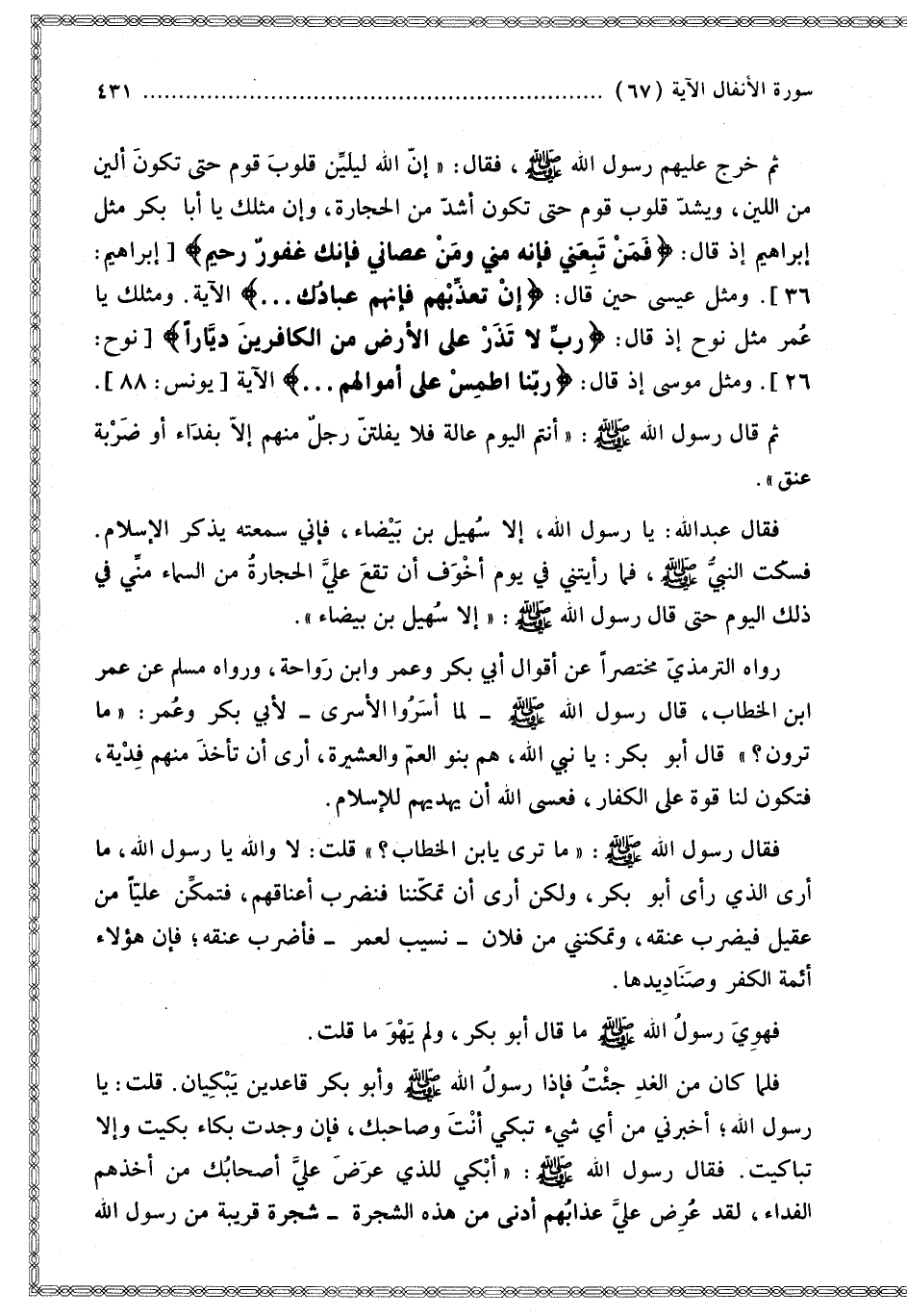 ، وَرَوَاهُ مُسْلِمٌ عَنْ عُمَرَ بْنِ الْخَطَّابِ قَالَ رَسُولُ اللَّهِ - صَلَّى اللَّهُ عَلَيْهِ وَسَلَّمَ -: «لَمَّا أَسَرُوا الْأَسْرَى لِأَبِي بَكْرٍ وَعُمَرَ: مَا تَرَوْنَ؟ قَالَ أَبُو بَكْرٍ: يَا نَبِيَّ اللَّهِ، هُمْ بَنُو الْعَمِّ وَالْعَشِيرَةِ، أَرَى أَنْ تَأْخُذَ مِنْهُمْ فِدْيَةً، فَتَكُونَ لَنَا قُوَّةً عَلَى الْكُفَّارِ، فَعَسَى اللَّهُ أَنْ يَهْدِيَهُمْ لِلْإِسْلَامِ. فَقَالَ رَسُولُ اللَّهِ - صَلَّى اللَّهُ عَلَيْهِ وَسَلَّمَ -: مَا تَرَى يَا ابْنَ الْخَطَّابِ؟ قُلْت: وَاَللَّهِ يَا رَسُولَ اللَّهِ، مَا أَرَى الَّذِي رَأَى أَبُو بَكْرٍ، وَلَكِنْ أَرَى أَنْ تُمَكِّنَنَا فَنَضْرِبَ أَعْنَاقَهُمْ، فَتُمَكِّنَ عَلِيًّا مِنْ عَقِيلٍ فَيَضْرِبَ عُنُقَهُ، وَتُمَكِّنَنِي مِنْ فُلَانٍ نَسِيبٍ بِأَحَالَ فَأَضْرِبَ عُنُقَهُ؛ فَإِنَّ هَؤُلَاءِ أَئِمَّةُ الْكُفْرِ وَصَنَادِيدُهَا. فَهَوِيَ رَسُولُ اللَّهِ - صَلَّى اللَّهُ عَلَيْهِ وَسَلَّمَ - مَا قَالَ أَبُو بَكْرٍ، وَلَمْ يَهْوَ مَا قُلْت. فَلَمَّا كَانَ مِنْ الْغَدِ جِئْت، فَإِذَا رَسُولُ اللَّهِ - صَلَّى اللَّهُ عَلَيْهِ وَسَلَّمَ - وَأَبُو بَكْرٍ قَاعِدَيْنِ يَبْكِيَانِ قُلْت: يَا رَسُولَ اللَّهِ؛ أَخْبِرْنِي مِنْ أَيِّ شَيْءٍ تَبْكِي أَنْتَ وَصَاحِبُك، فَإِنْ وَجَدْت بُكَاءً بَكَيْت وَإِلَّا تَبَاكَيْت. فَقَالَ رَسُولُ اللَّهِ - صَلَّى اللَّهُ عَلَيْهِ وَسَلَّمَ -: أَبْكِي لِلَّذِي عَرَضَ عَلَيَّ أَصْحَابُك مِنْ أَخْذِهِمْ الْفِدَاءَ، لَقَدْ عُرِضَ عَلَيَّ عَذَابُهُمْ أَدْنَى مِنْ هَذِهِ الشَّجَرَةِ شَجَرَةٍ قَرِيبَةٍ مِنْ رَسُولِ اللَّهِ