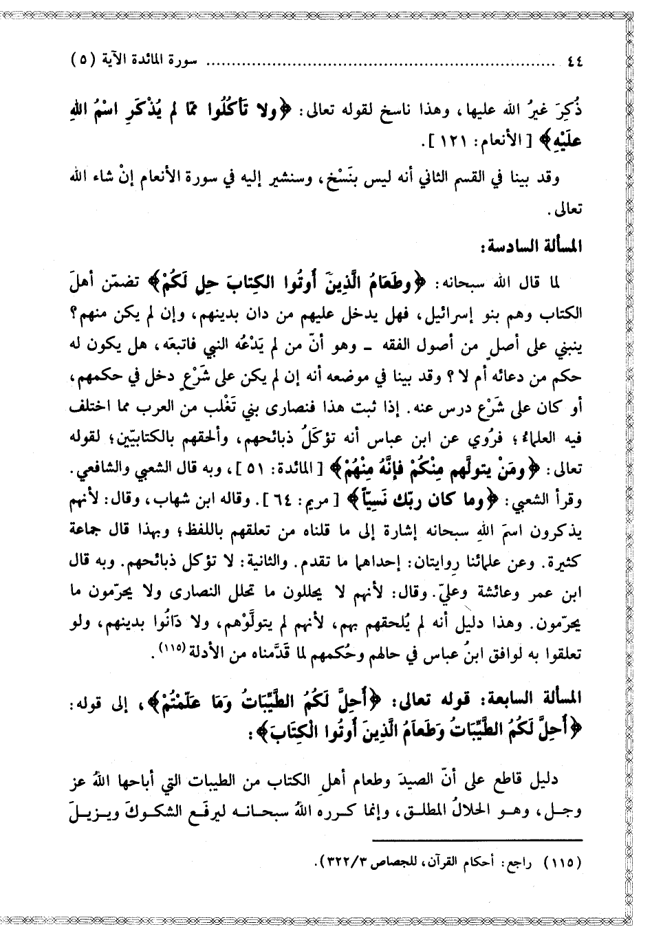 الْمَسْأَلَةُ السَّابِعَةُ: قَوْله تَعَالَى: {أُحِلَّ لَكُمُ الطَّيِّبَاتُ وَمَا عَلَّمْتُمْ} [المائدة: 4]، إلَى قَوْلِهِ: {أُحِلَّ لَكُمُ الطَّيِّبَاتُ وَطَعَامُ الَّذِينَ أُوتُوا الْكِتَابَ} [المائدة: 5] دَلِيلٌ قَاطِعٌ عَلَى أَنَّ الصَّيْدَ وَطَعَامَ أَهْلِ الْكِتَابِ مِنْ الطَّيِّبَاتِ الَّتِي أَبَاحَهَا اللَّهُ عَزَّ وَجَلَّ، وَهُوَ الْحَلَالُ الْمُطْلَقُ، وَإِنَّمَا كَرَّرَهُ اللَّهُ سُبْحَانَهُ لِيَرْفَعَ الشُّكُوكَ وَيُزِيلَ