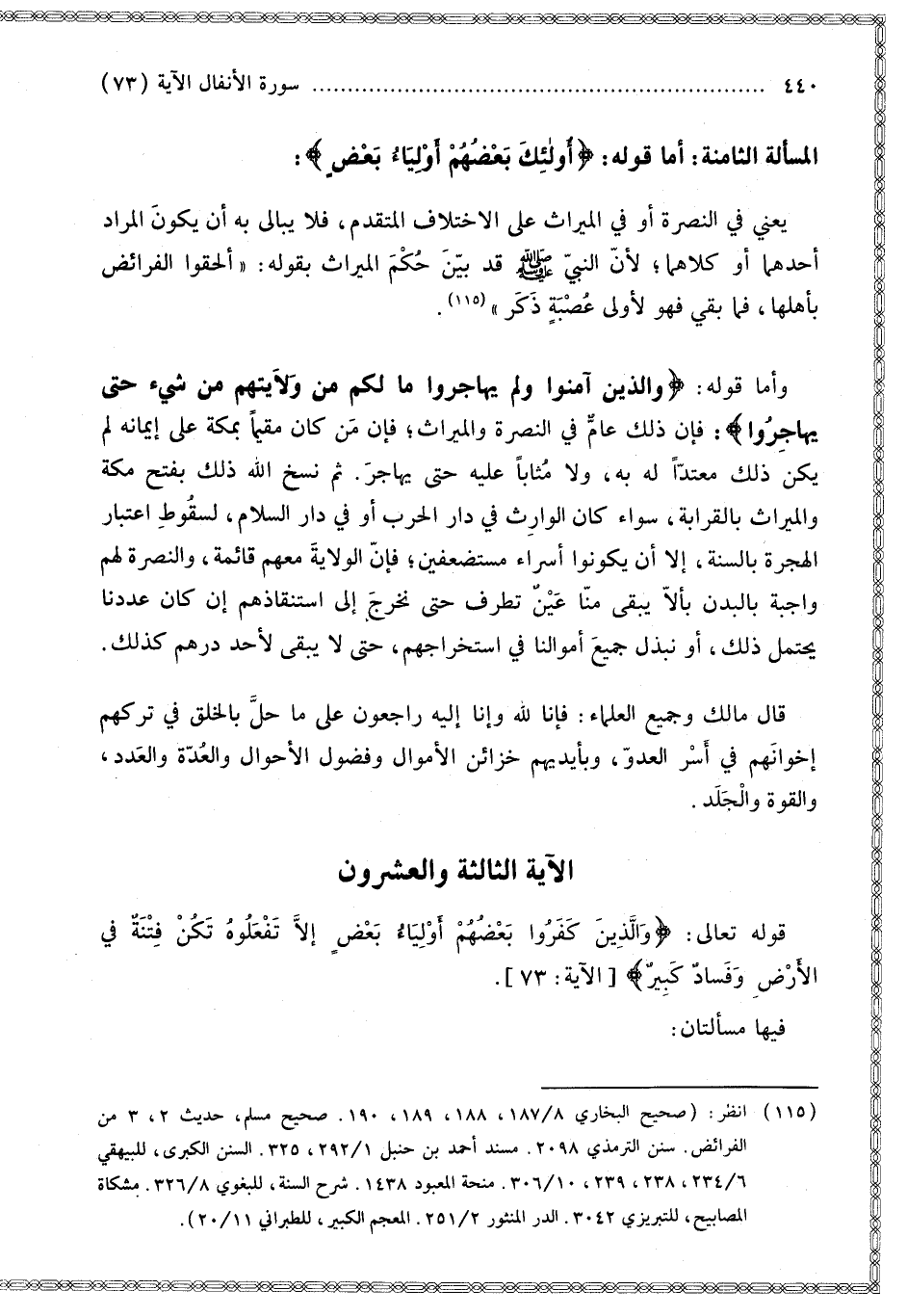 ٍ إِلا تَفْعَلُوهُ تَكُنْ فِتْنَةٌ فِي الأَرْضِ وَفَسَادٌ كَبِيرٌ} [الأنفال: 73] فِيهَا مَسْأَلَتَانِ: