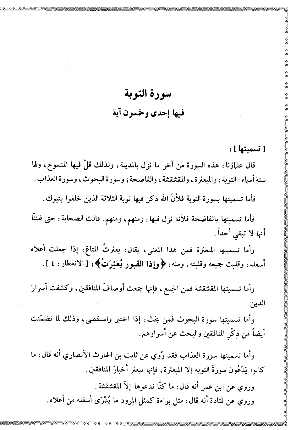ً [تَسْمِيَتُهَا]: قَالَ عُلَمَاؤُنَا: هَذِهِ السُّورَةُ مِنْ آخِرِ مَا نَزَلَ بِالْمَدِينَةِ، وَلِذَلِكَ قَلَّ فِيهَا الْمَنْسُوخُ، وَلَهَا سِتَّةُ أَسْمَاءً: التَّوْبَةُ، وَالْمُبَعْثِرَةُ، وَالْمُقَشْقِشَةُ، وَالْفَاضِحَةُ وَسُورَةُ الْبُحُوثِ، وَسُورَةُ الْعَذَابِ.