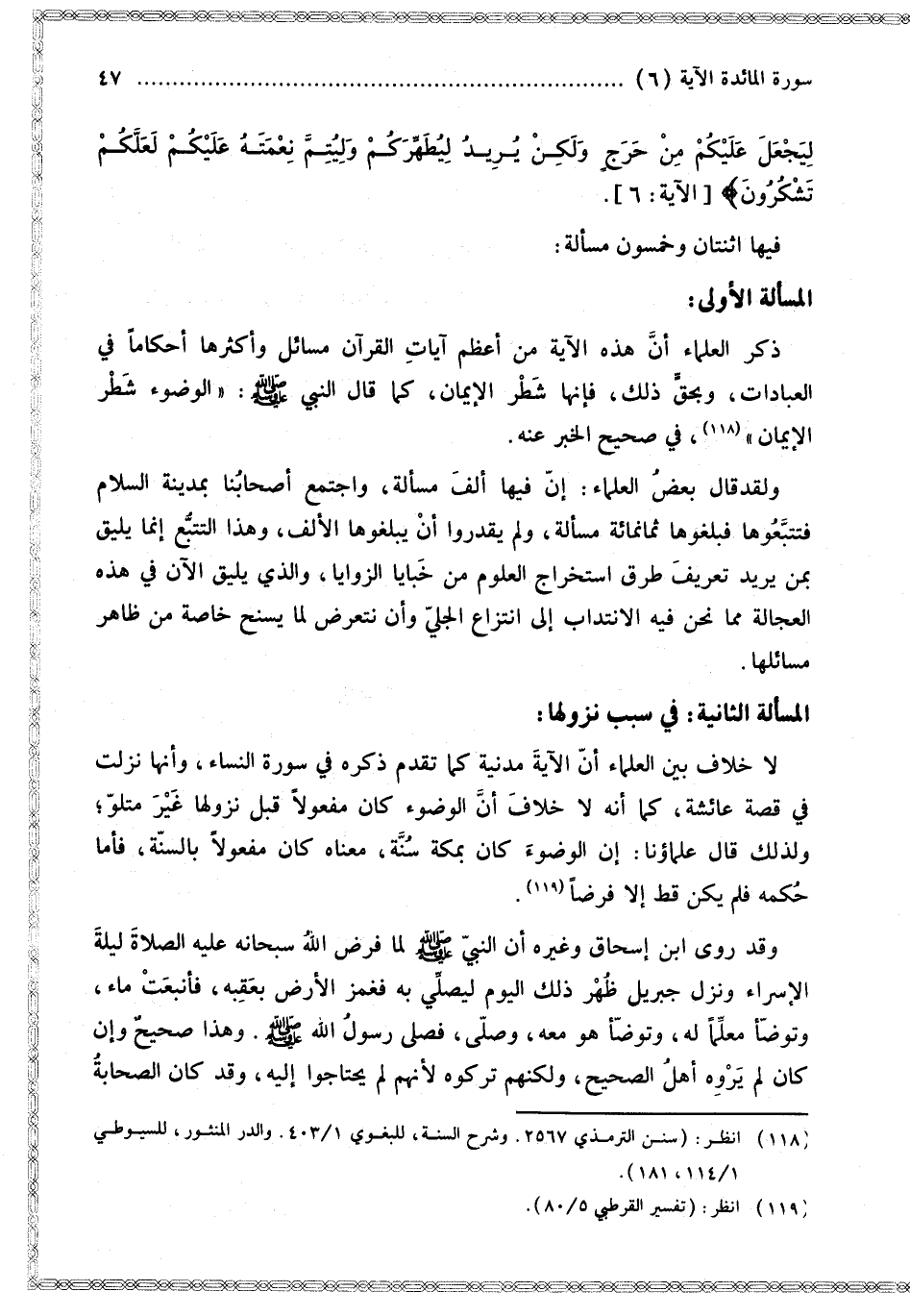 الْمَسْأَلَةُ الْأُولَى: ذَكَرَ الْعُلَمَاءُ أَنَّ هَذِهِ الْآيَةَ مِنْ أَعْظَمِ آيَاتِ الْقُرْآنِ مَسَائِلَ وَأَكْثَرِهَا أَحْكَامًا فِي الْعِبَادَاتِ، وَبِحَقِّ ذَلِكَ، فَإِنَّهَا شَطْرُ الْإِيمَانِ، كَمَا قَالَ النَّبِيُّ - صَلَّى اللَّهُ عَلَيْهِ وَسَلَّمَ -: «الْوُضُوءُ شَطْرُ الْإِيمَانِ»، فِي صَحِيحِ الْخَبَرِ عَنْهُ. وَلَقَدْ قَالَ بَعْضُ الْعُلَمَاءِ: إنَّ فِيهَا أَلْفَ مَسْأَلَةٍ، وَاجْتَمَعَ أَصْحَابُنَا بِمَدِينَةِ السَّلَامِ فَتَتَبَّعُوهَا فَبَلَّغُوهَا ثَمَانَمِائَةِ مَسْأَلَةٍ، وَلَمْ يَقْدِرُوا أَنْ يُبَلِّغُوهَا الْأَلْفَ، وَهَذَا التَّتَبُّعُ إنَّمَا يَلِيقُ بِمَنْ يُرِيدُ تَعْرِيفَ طُرُقِ اسْتِخْرَاجِ الْعُلُومِ مِنْ خَبَايَا الزَّوَايَا، وَاَلَّذِي يَلِيقُ الْآنَ فِي هَذِهِ الْعُجَالَةِ مِمَّا نَحْنُ فِيهِ الِانْتِدَابُ إلَى انْتِزَاعِ الْجَلِيِّ وَأَنْ نَتَعَرَّضَ لِمَا يَسْنَحُ خَاصَّةً مِنْ ظَاهِرِ مَسَائِلِهَا.