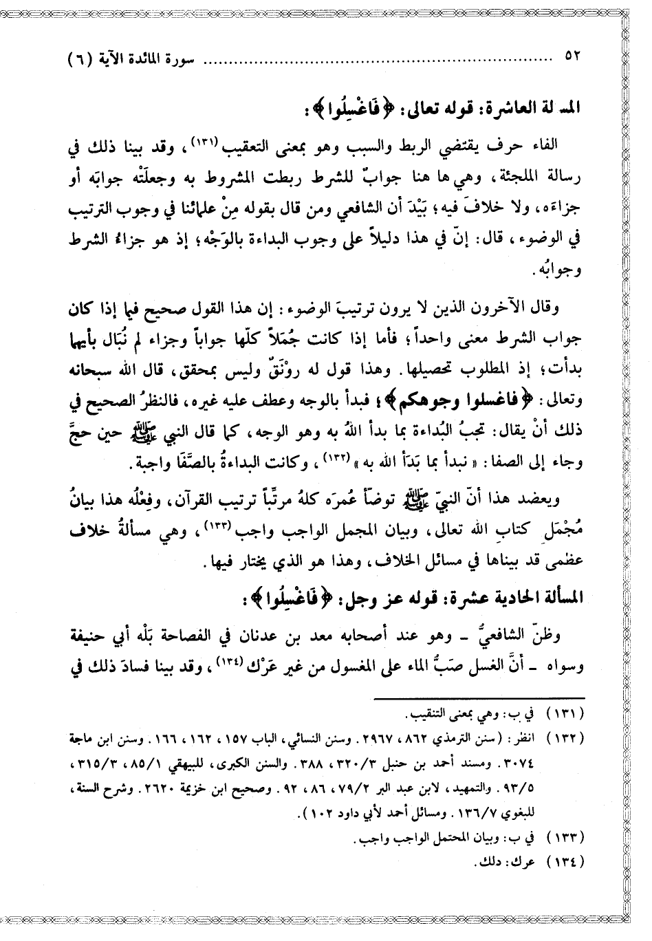 الْمَسْأَلَةُ الْعَاشِرَةُ: قَوْله تَعَالَى: {فَاغْسِلُوا} [المائدة: 6]: الْفَاءُ حَرْفٌ يَقْتَضِي الرَّبْطَ وَالسَّبَبَ وَهُوَ بِمَعْنَى التَّعْقِيبِ، وَقَدْ بَيَّنَّا ذَلِكَ فِي رِسَالَةِ الْمُلْجِئَةِ، وَهِيَ هَاهُنَا جَوَابٌ لِلشَّرْطِ رَبَطَتْ الْمَشْرُوطَ بِهِ وَجَعَلَتْهُ جَوَابَهُ أَوْ جَزَاءَهُ، وَلَا خِلَافَ فِيهِ؛ بَيْدَ أَنَّ الشَّافِعِيَّ وَمَنْ قَالَ بِقَوْلِهِ مِنْ عُلَمَائِنَا فِي وُجُوبِ التَّرْتِيبِ فِي الْوُضُوءِ قَالَ: إنَّ فِي هَذَا دَلِيلًا عَلَى وُجُوبِ الْبُدَاءَةِ بِالْوَجْهِ؛ إذْ هُوَ جَزَاءُ الشَّرْطِ وَجَوَابُهُ.