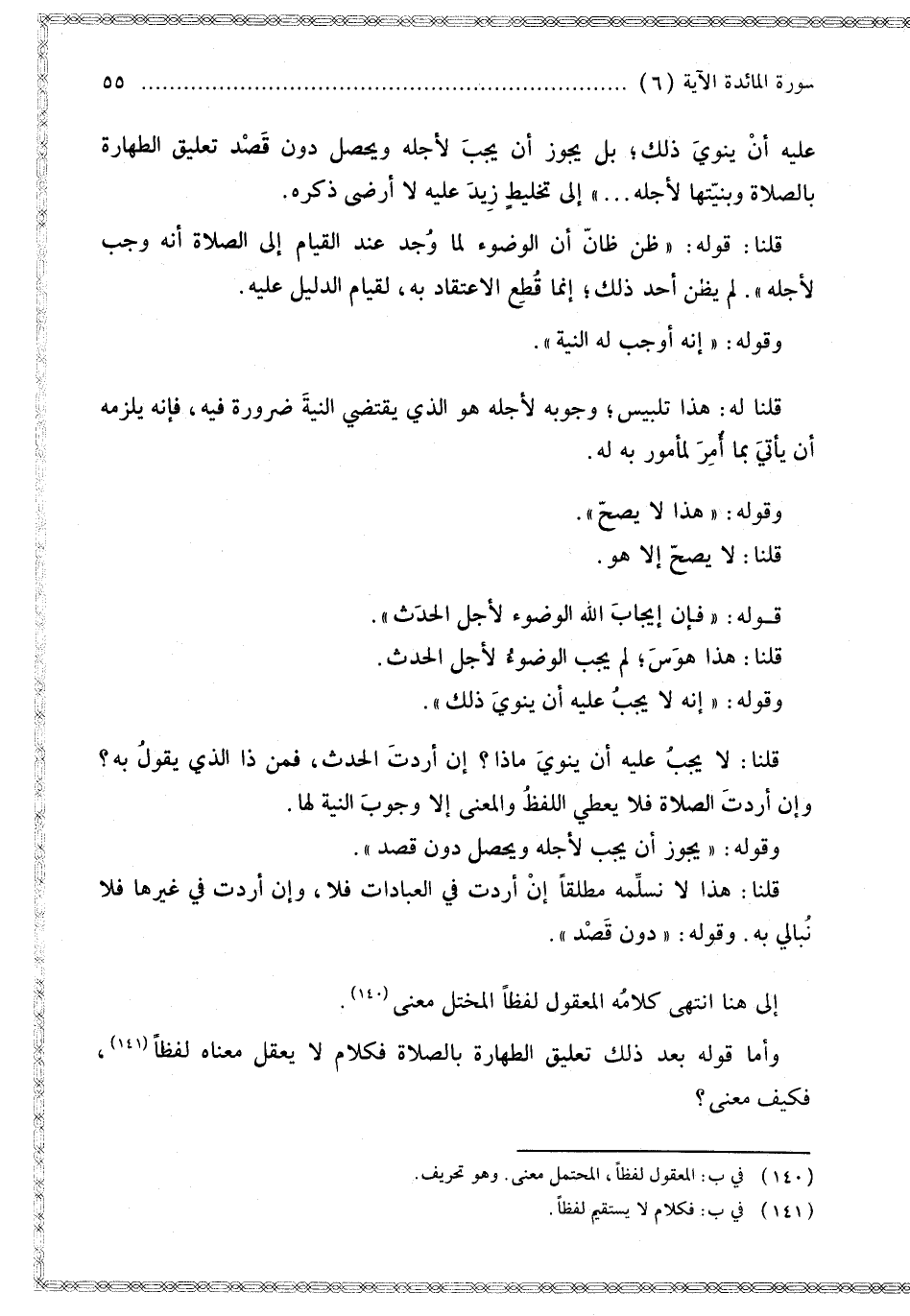عَلَيْهِ أَنْ يَنْوِيَ ذَلِكَ، بَلْ يَجُوزُ أَنْ يَجِبَ لِأَجْلِهِ وَيَحْصُلَ دُونَ قَصْدِ تَعْلِيقِ الطَّهَارَةِ بِالصَّلَاةِ وَبِنِيَّتِهَا لِأَجْلِهِ " إلَى تَخْلِيطٍ زِيدَ عَلَيْهِ لَا أَرْضَى ذِكْرَهُ. قُلْنَا: قَوْلُهُ: " ظَنَّ ظَانٌّ أَنَّ الْوُضُوءَ لَمَّا وُجِدَ عِنْدَ الْقِيَامِ إلَى الصَّلَاةِ أَنَّهُ وَجَبَ لِأَجْلِهِ ". لَمْ يَظُنَّ أَحَدٌ ذَلِكَ، إنَّمَا قُطِعَ الِاعْتِقَادُ بِهِ، لِقِيَامِ الدَّلِيلِ عَلَيْهِ. وَقَوْلُهُ: " إنَّهُ أَوْجَبَ لَهُ النِّيَّةَ ".
