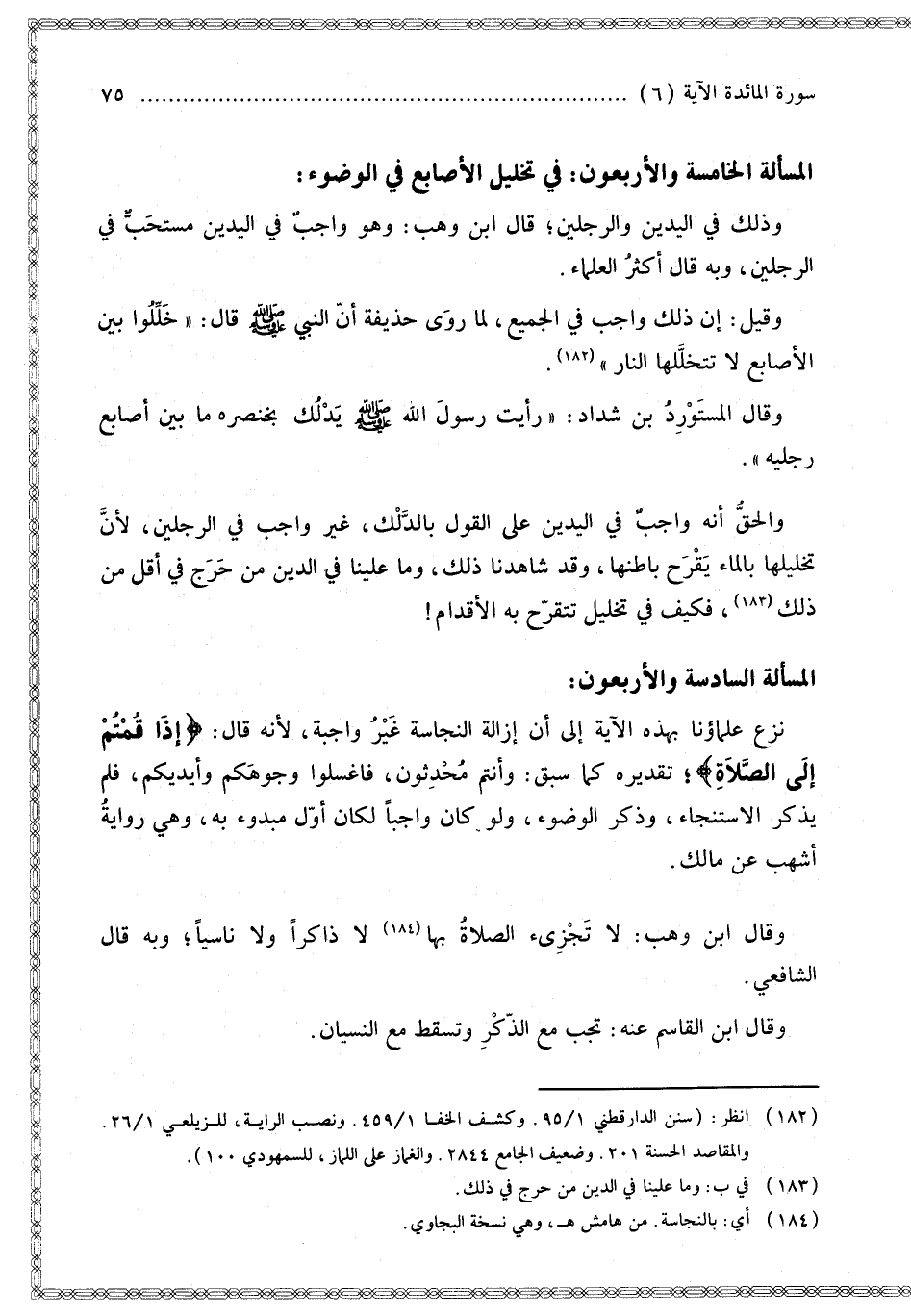 الْمَسْأَلَةُ الْخَامِسَةُ وَالْأَرْبَعُونَ: فِي تَخْلِيلِ الْأَصَابِعِ فِي الْوُضُوءِ: وَذَلِكَ فِي الْيَدَيْنِ وَالرِّجْلَيْنِ؛ قَالَ ابْنُ وَهْبٍ: وَهُوَ وَاجِبٌ فِي الْيَدَيْنِ مُسْتَحَبٌّ فِي الرِّجْلَيْنِ، وَبِهِ قَالَ أَكْثَرُ الْعُلَمَاءِ. وَقِيلَ: إنَّ ذَلِكَ وَاجِبٌ فِي الْجَمِيعِ، لِمَا رَوَى حُذَيْفَةُ أَنَّ النَّبِيَّ - صَلَّى اللَّهُ عَلَيْهِ وَسَلَّمَ - قَالَ: «خَلِّلُوا بَيْنَ الْأَصَابِعِ لَا تَتَخَلَّلُهَا النَّارُ». وَقَالَ الْمُسْتَوْرِدُ بْنُ شَدَّادٍ: «رَأَيْت رَسُولَ اللَّهِ - صَلَّى اللَّهُ عَلَيْهِ وَسَلَّمَ - يُدَلِّكُ بِخِنْصَرِهِ مَا بَيْنَ أَصَابِعِ رِجْلَيْهِ». وَالْحَقُّ أَنَّهُ وَاجِبٌ فِي الْيَدَيْنِ عَلَى الْقَوْلِ بِالدَّلْكِ، غَيْرُ وَاجِبٍ فِي الرِّجْلَيْنِ، لِأَنَّ تَخْلِيلَهَا بِالْمَاءِ يُقَرِّحُ بَاطِنَهَا، وَقَدْ شَاهَدْنَا ذَلِكَ، وَمَا عَلَيْنَا فِي الدِّينِ مِنْ حَرَجٍ فِي أَقَلَّ مِنْ ذَلِكَ، فَكَيْفَ فِي تَخْلِيلٍ تَتَقَرَّحُ بِهِ الْأَقْدَامُ،