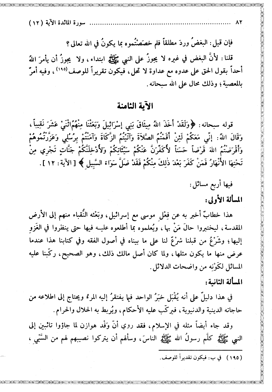 الْآيَةُ الثَّامِنَةُ قَوْلُهُ سُبْحَانَهُ: {وَلَقَدْ أَخَذَ اللَّهُ مِيثَاقَ بَنِي إِسْرَائِيلَ وَبَعَثْنَا مِنْهُمُ اثْنَيْ عَشَرَ نَقِيبًا وَقَالَ اللَّهُ إِنِّي مَعَكُمْ لَئِنْ أَقَمْتُمُ الصَّلاةَ وَآتَيْتُمُ الزَّكَاةَ وَآمَنْتُمْ بِرُسُلِي وَعَزَّرْتُمُوهُمْ وَأَقْرَضْتُمُ اللَّهَ قَرْضًا حَسَنًا لأُكَفِّرَنَّ عَنْكُمْ سَيِّئَاتِكُمْ وَلأُدْخِلَنَّكُمْ جَنَّاتٍ تَجْرِي مِنْ تَحْتِهَا الأَنْهَارُ فَمَنْ كَفَرَ بَعْدَ ذَلِكَ مِنْكُمْ فَقَدْ ضَلَّ سَوَاءَ السَّبِيلِ} [المائدة: 12]. فِيهَا أَرْبَعُ مَسَائِلَ: