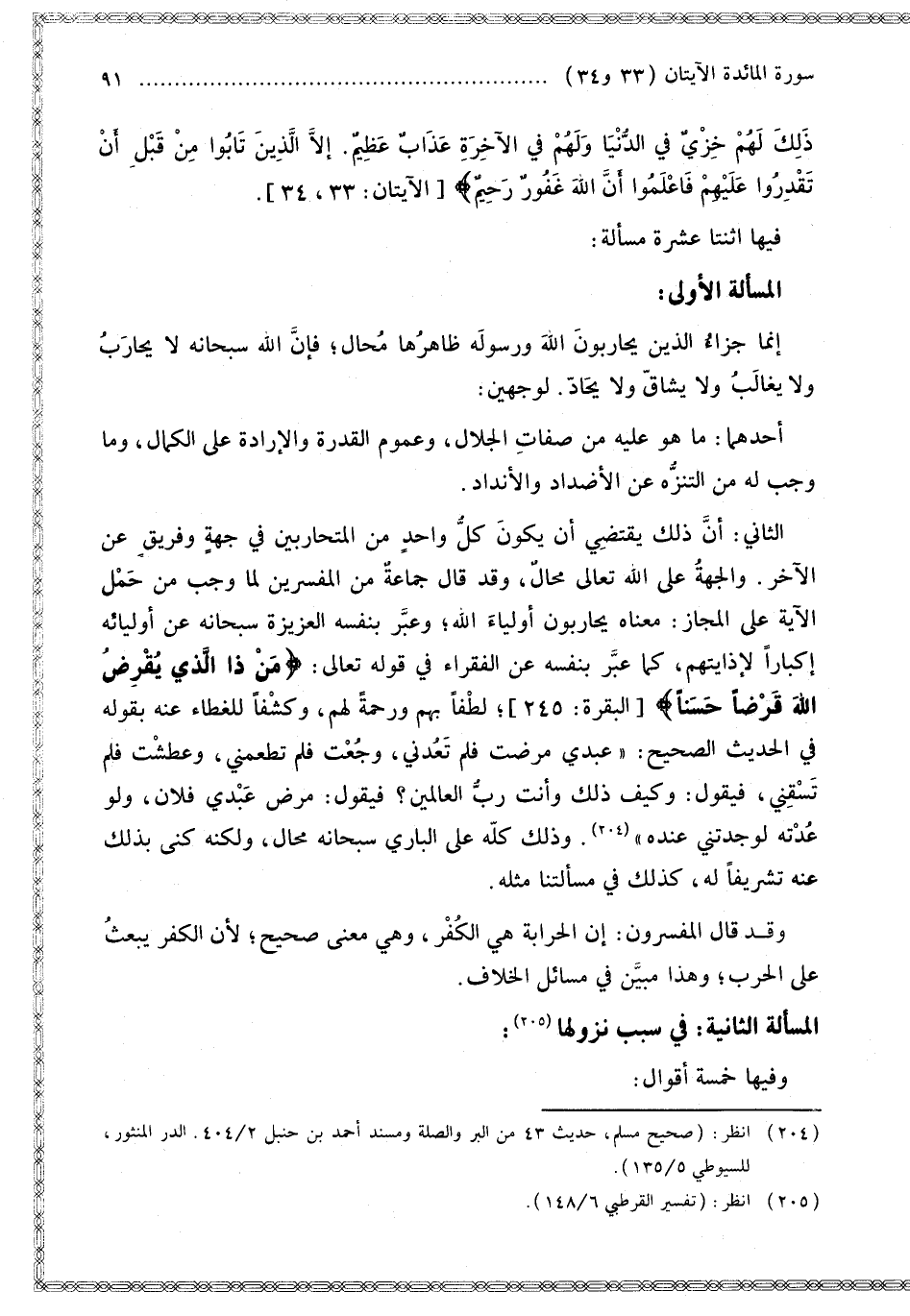 الثَّانِي: أَنَّ ذَلِكَ يَقْتَضِي أَنْ يَكُونَ كُلُّ وَاحِدٍ مِنْ الْمُتَحَارِبِينَ فِي جِهَةٍ وَفَرِيقٍ عَنْ الْآخَرِ. وَالْجِهَةُ عَلَى اللَّهِ تَعَالَى مُحَالٌ، وَقَدْ قَالَ جَمَاعَةٌ مِنْ الْمُفَسِّرِينَ لِمَا وَجَبَ مِنْ حَمْلِ الْآيَةِ عَلَى الْمَجَازِ: مَعْنَاهُ يُحَارِبُونَ أَوْلِيَاءَ اللَّهِ؛ وَعَبَّرَ بِنَفْسِهِ الْعَزِيزَةِ سُبْحَانَهُ عَنْ أَوْلِيَائِهِ إكْبَارًا لِإِذَايَتِهِمْ، كَمَا عَبَّرَ بِنَفْسِهِ عَنْ الْفُقَرَاءِ فِي قَوْله تَعَالَى: {مَنْ ذَا الَّذِي يُقْرِضُ اللَّهَ قَرْضًا حَسَنًا} [البقرة: 245] لُطْفًا بِهِمْ وَرَحْمَةً لَهُمْ، وَكَشْفًا لِلْغِطَاءِ عَنْهُ بِقَوْلِهِ فِي الْحَدِيثِ الصَّحِيحِ: «عَبْدِي مَرِضْت فَلَمْ تَعُدْنِي، وَجُعْت فَلَمْ تُطْعِمْنِي، وَعَطِشْت فَلَمْ تَسْقِنِي، فَيَقُولُ: وَكَيْفَ ذَلِكَ وَأَنْتَ رَبُّ الْعَالَمِينَ؟ فَيَقُولُ: مَرِضَ عَبْدِي فُلَانٌ، وَلَوْ عُدْتَهُ لَوَجَدْتَنِي عِنْدَهُ». وَذَلِكَ كُلُّهُ عَلَى الْبَارِي سُبْحَانَهُ مُحَالٌ، وَلَكِنَّهُ كَنَّى بِذَلِكَ عَنْهُ تَشْرِيفًا لَهُ، كَذَلِكَ فِي مَسْأَلَتِنَا مِثْلُهُ. وَقَدْ قَالَ الْمُفَسِّرُونَ: إنَّ الْحِرَابَةَ هِيَ الْكُفْرُ، وَهِيَ مَعْنًى صَحِيحٌ؛ لِأَنَّ الْكُفْرَ يَبْعَثُ عَلَى الْحَرْبِ؛ وَهَذَا مُبَيَّنٌ فِي مَسَائِلِ الْخِلَافِ.