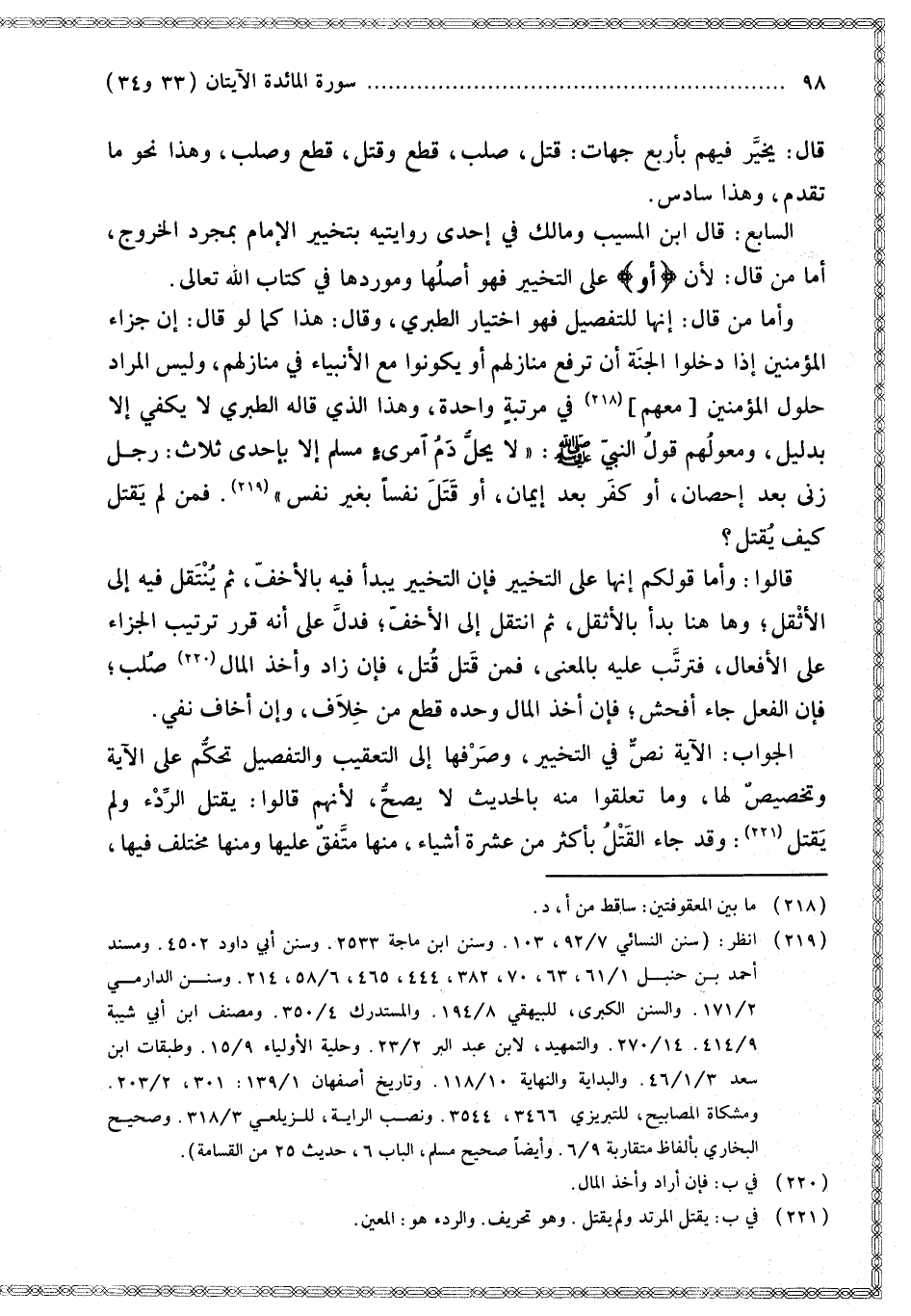 وَأَمَّا مَنْ قَالَ: إنَّهَا لِلتَّفْصِيلِ فَهُوَ اخْتِيَارُ الطَّبَرِيِّ، وَقَالَ: هَذَا كَمَا لَوْ قَالَ: إنَّ جَزَاءَ الْمُؤْمِنِينَ إذَا دَخَلُوا الْجَنَّةَ أَنْ تُرْفَعَ مَنَازِلُهُمْ أَوْ يَكُونُوا مَعَ الْأَنْبِيَاءِ فِي مَنَازِلِهِمْ، وَلَيْسَ الْمُرَادُ حُلُولَ الْمُؤْمِنِينَ مَعَهُمْ فِي مَرْتَبَةٍ وَاحِدَةٍ، وَهَذَا الَّذِي قَالَهُ الطَّبَرِيُّ لَا يَكْفِي إلَّا بِدَلِيلٍ، وَمِعْوَلُهُمْ قَوْلُ النَّبِيِّ - صَلَّى اللَّهُ عَلَيْهِ وَسَلَّمَ -: «لَا يَحِلُّ دَمُ امْرِئٍ مُسْلِمٍ إلَّا بِإِحْدَى ثَلَاثٍ: رَجُلٌ زَنَى بَعْدَ إحْصَانٍ، أَوْ كَفَرَ بَعْدَ إيمَانٍ، أَوْ قَتَلَ نَفْسًا بِغَيْرِ نَفْسٍ». فَمَنْ لَمْ يَقْتُلْ كَيْفَ يُقْتَلُ؟ قَالُوا وَأَمَّا قَوْلُكُمْ إنَّهَا عَلَى التَّخْيِيرِ فَإِنْ التَّخْيِيرَ يُبْدَأُ فِيهِ بِالْأَخَفِّ، ثُمَّ يُنْتَقَلُ فِيهِ إلَى الْأَثْقَلِ؛ وَهَا هُنَا بَدَأَ بِالْأَثْقَلِ، ثُمَّ انْتَقَلَ إلَى الْأَخَفِّ؛ فَدَلَّ عَلَى أَنَّهُ قَرَّرَ تَرْتِيبَ الْجَزَاءِ عَلَى الْأَفْعَالِ، فَتَرَتَّبَ عَلَيْهِ بِالْمَعْنَى، فَمَنْ قَتَلَ قُتِلَ، فَإِنْ زَادَ وَأَخَذَ الْمَالَ صُلِبَ؛ فَإِنَّ الْفِعْلَ جَاءَ أَفْحَشَ؛ فَإِنْ أَخَذَ الْمَالَ وَحْدَهُ قُطِّعَ مِنْ خِلَافٍ، وَإِنْ أَخَافَ نُفِيَ.