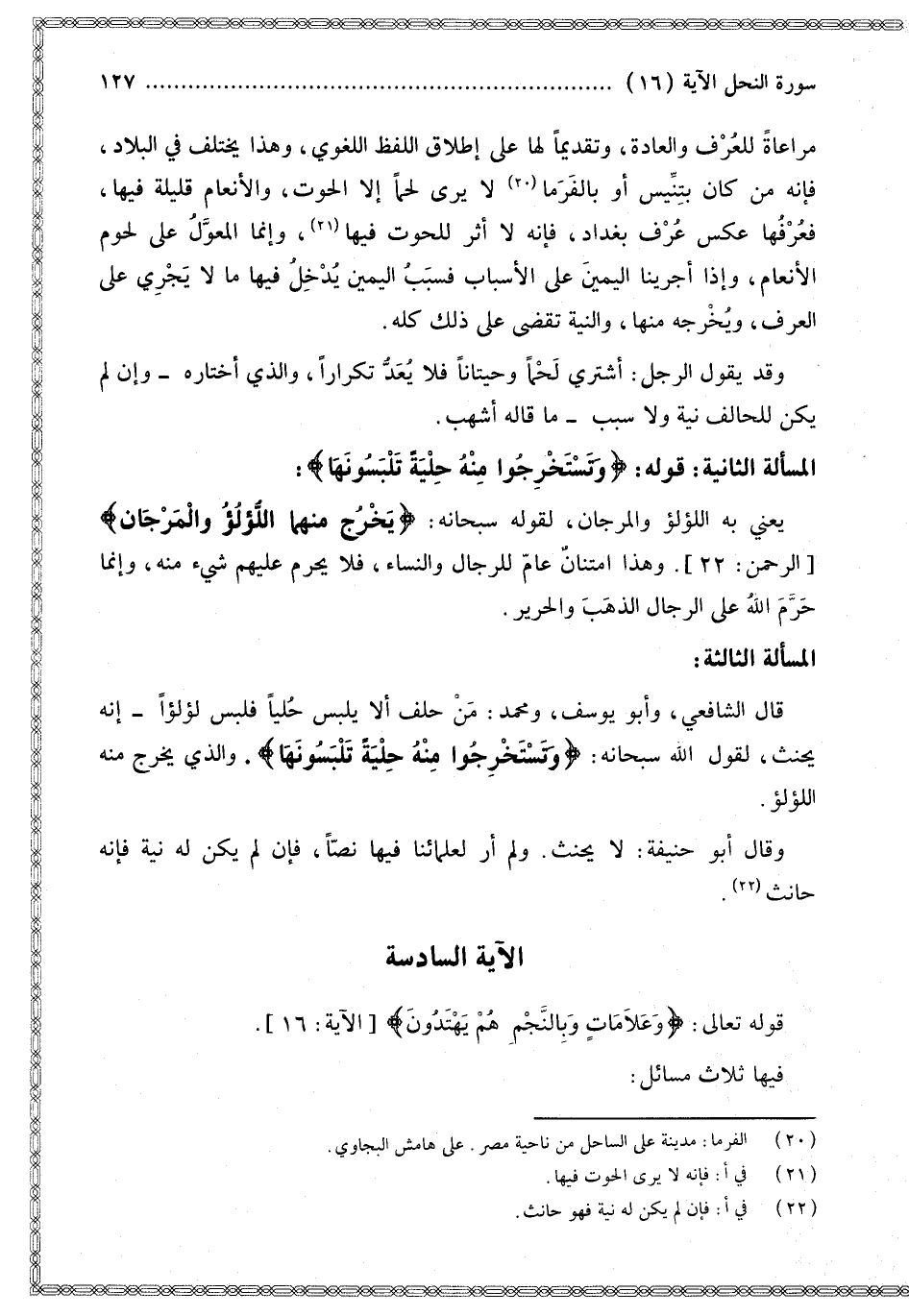الْمَسْأَلَةُ الثَّانِيَةُ: قَوْلُهُ: {وَتَسْتَخْرِجُوا مِنْهُ حِلْيَةً تَلْبَسُونَهَا} [النحل: 14]: يَعْنِي بِهِ اللُّؤْلُؤَ وَالْمَرْجَانَ، لِقَوْلِهِ سُبْحَانَهُ: {يَخْرُجُ مِنْهُمَا اللُّؤْلُؤُ وَالْمَرْجَانُ} [الرحمن: 22].