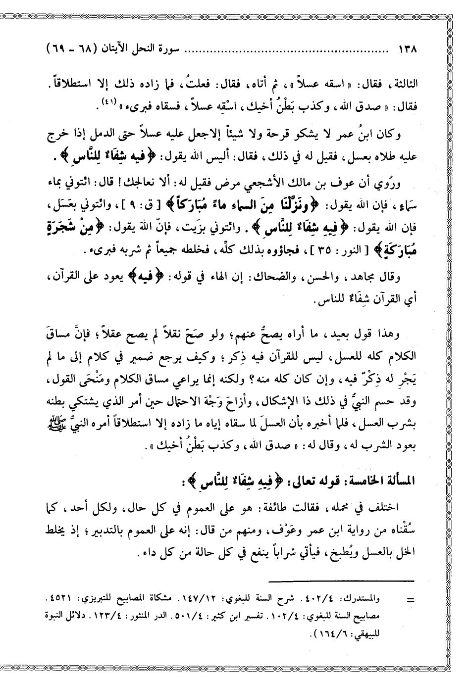 الْمَسْأَلَةُ الْخَامِسَةُ: قَوْله تَعَالَى: {فِيهِ شِفَاءٌ لِلنَّاسِ} [النحل: 69]: اُخْتُلِفَ فِي مَحْمَلِهِ، فَقَالَتْ طَائِفَةٌ: هُوَ عَلَى الْعُمُومِ فِي كُلِّ حَالٍ، وَلِكُلِّ أَحَدٍ، كَمَا سُقْنَاهُ مِنْ رِوَايَةِ ابْنِ عُمَرَ وَعَوْفٍ، وَمِنْهُمْ مَنْ قَالَ: إنَّهُ عَلَى الْعُمُومِ بِالتَّدْبِيرِ؛ إذْ يُخْلَطُ الْخَلُّ بِالْعَسَلِ وَيَطْبُخُ، فَيَأْتِي شَرَابًا يَنْفَعُ فِي كُلِّ حَالَةٍ مِنْ كُلِّ دَاءٍ.