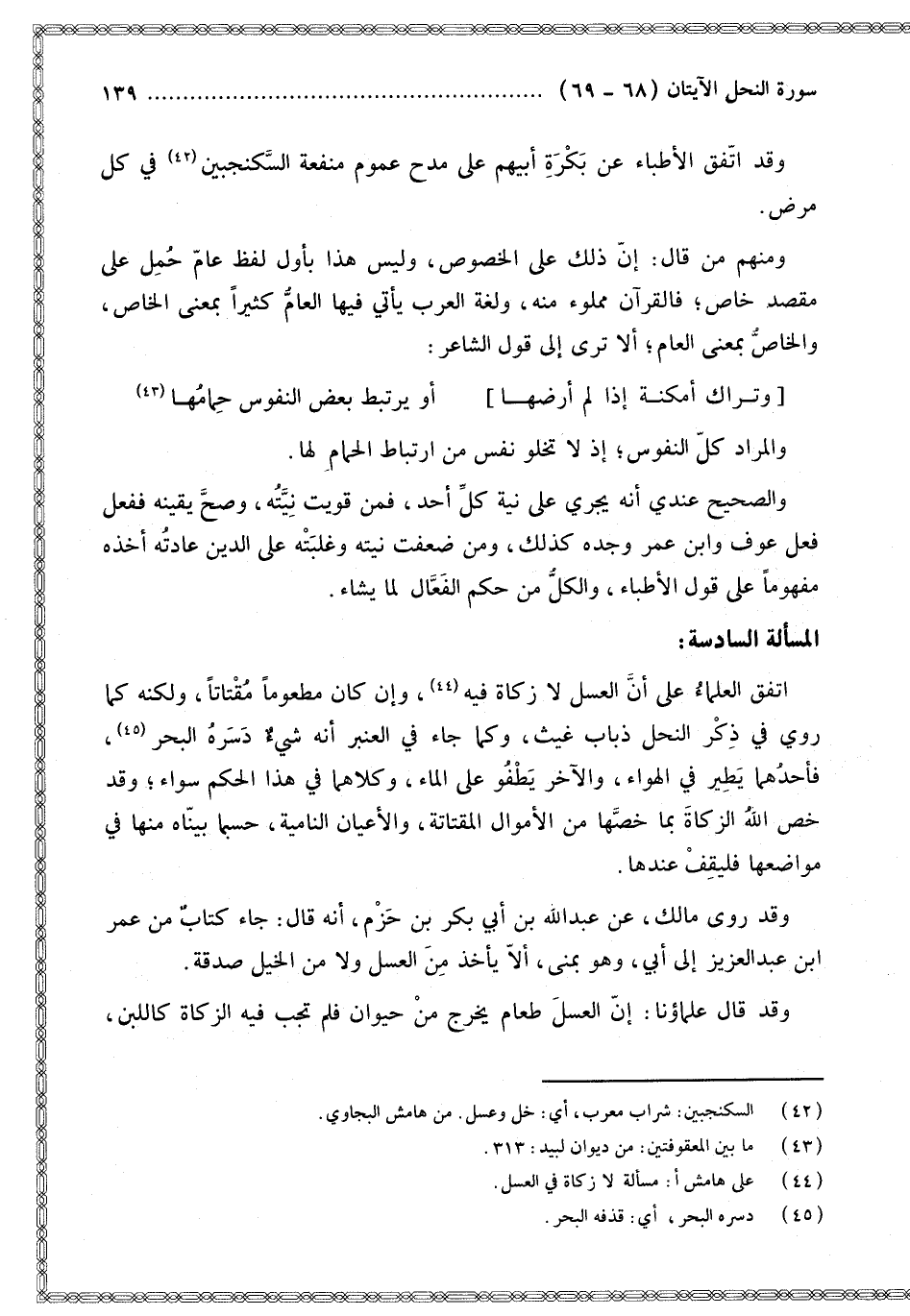 وَقَدْ اتَّفَقَ الْأَطِبَّاءُ عَنْ بَكْرَةِ أَبِيهِمْ عَلَى مَدْحِ عُمُومِ مَنْفَعَةِ السَّكَنْجَبِينِ فِي كُلِّ مَرَضٍ. وَمِنْهُمْ مَنْ قَالَ: إنَّ ذَلِكَ عَلَى الْخُصُوصِ، وَلَيْسَ هَذَا بِأَوَّلِ لَفْظٍ عَامٍّ حُمِلَ عَلَى مَقْصِدٍ خَاصٍّ؛ فَالْقُرْآنُ مَمْلُوءٌ مِنْهُ، وَلُغَةُ الْعَرَبِ يَأْتِي فِيهَا الْعَامُّ كَثِيرًا بِمَعْنَى الْخَاصِّ، وَالْخَاصُّ بِمَعْنَى الْعَامِّ؛ أَلَا تَرَى إلَى قَوْلِ الشَّاعِرِ: