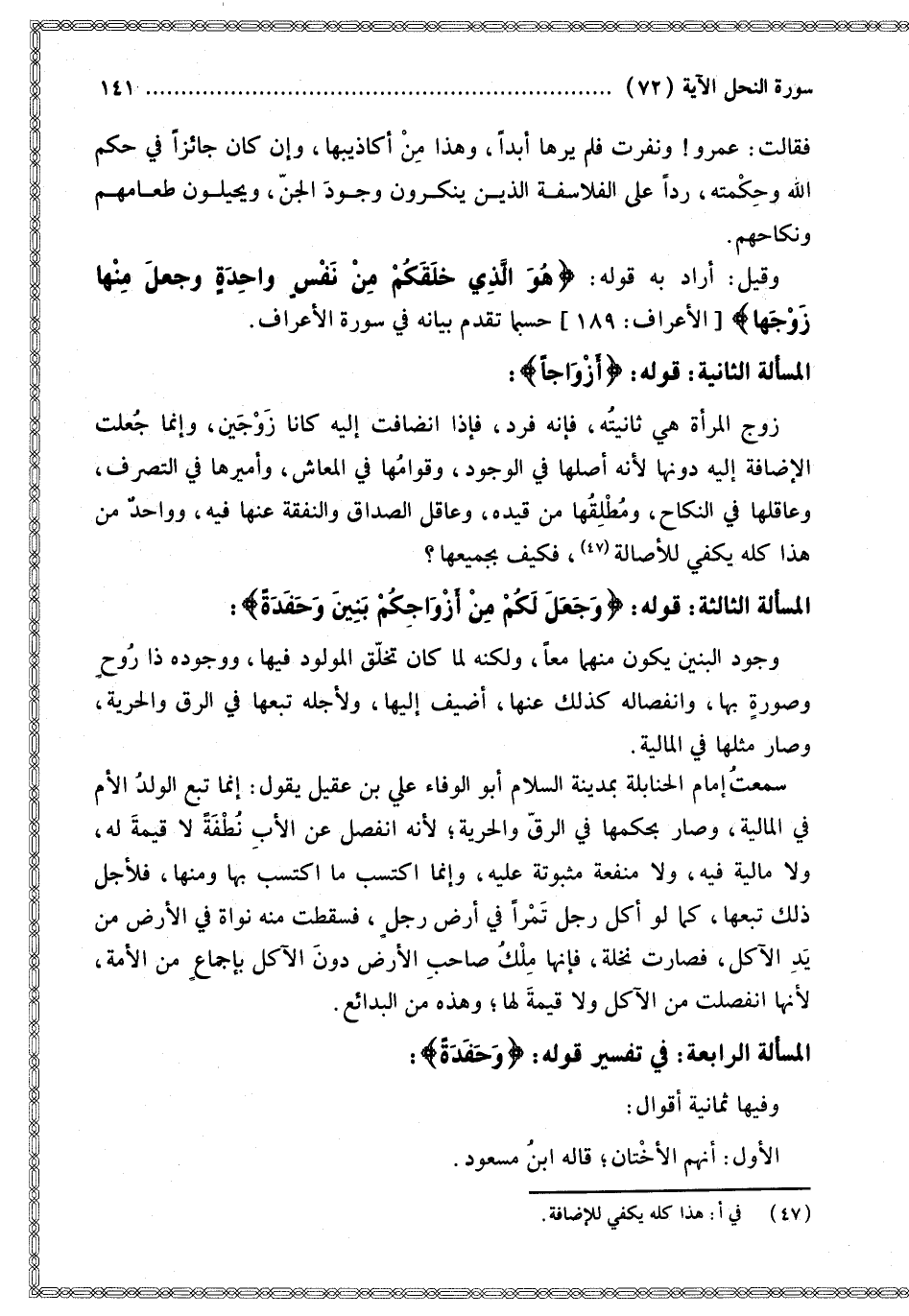 الْمَسْأَلَةُ الثَّالِثَةُ: قَوْلُهُ: {وَجَعَلَ لَكُمْ مِنْ أَزْوَاجِكُمْ بَنِينَ وَحَفَدَةً} [النحل: 72]: وُجُودُ الْبَنِينَ يَكُونُ مِنْهُمَا مَعًا، وَلَكِنَّهُ لَمَّا كَانَ تَخَلُّقُ الْمَوْلُودِ فِيهَا، وَوُجُودُهُ ذَا رُوحٍ وَصُورَةٍ بِهَا، وَانْفِصَالُهُ كَذَلِكَ عَنْهَا، أُضِيفَ إلَيْهَا، وَلِأَجْلِهِ تَبِعَهَا فِي الرِّقِّ وَالْحُرِّيَّةِ، وَصَارَ مِثْلَهَا فِي الْمَالِيَّةِ.
