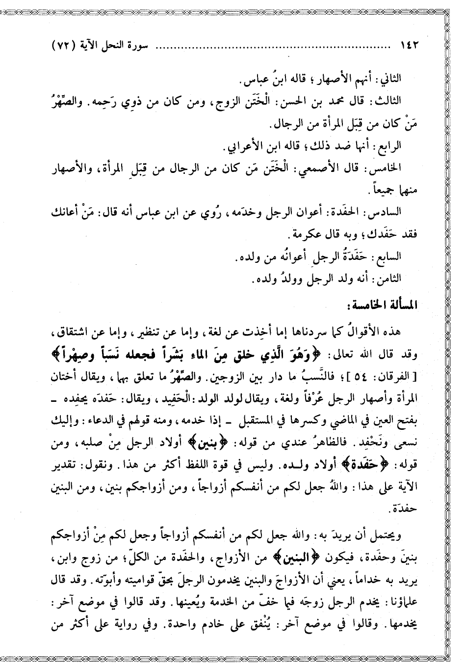 الْمَسْأَلَةُ الْخَامِسَةُ: هَذِهِ الْأَقْوَالُ كَمَا سَرَدْنَاهَا إمَّا أُخِذَتْ عَنْ لُغَةٍ، وَإِمَّا عَنْ تَنْظِيرٍ، وَإِمَّا عَنْ اشْتِقَاقٍ، وَقَدْ قَالَ اللَّهُ تَعَالَى: {وَهُوَ الَّذِي خَلَقَ مِنَ الْمَاءِ بَشَرًا فَجَعَلَهُ نَسَبًا وَصِهْرًا} [الفرقان: 54]؛ فَالنَّسَبُ مَا دَارَ بَيْنَ الزَّوْجَيْنِ. وَالصِّهْرُ مَا تَعَلَّقَ بِهِمَا، وَيُقَالُ أَخْتَانُ الْمَرْأَةِ وَأَصْهَارُ الرَّجُلِ عُرْفًا وَلُغَةً، وَيُقَالُ لِوَلَدِ الْوَلَدِ: الْحَفِيدُ، وَيُقَالُ: حَفِيدُهُ يَحْفِدُهُ بِفَتْحِ الْعَيْنِ فِي الْمَاضِي وَكَسْرِهَا فِي الْمُسْتَقْبَلِ إذَا خَدَمَهُ، وَمِنْهُ قَوْلُهُمْ فِي الدُّعَاءِ: وَإِلَيْك نَسْعَى وَنَحْفِدُ. فَالظَّاهِرُ عِنْدِي مِنْ قَوْلِهِ: {بَنِينَ} [النحل: 72] أَوْلَادُ الرَّجُلِ مِنْ صُلْبِهِ، وَمِنْ قَوْلِهِ: {وَحَفَدَةً} [النحل: 72] أَوْلَادُ وَلَدِهِ. وَلَيْسَ فِي قُوَّةِ اللَّفْظِ أَكْثَرُ مِنْ هَذَا.