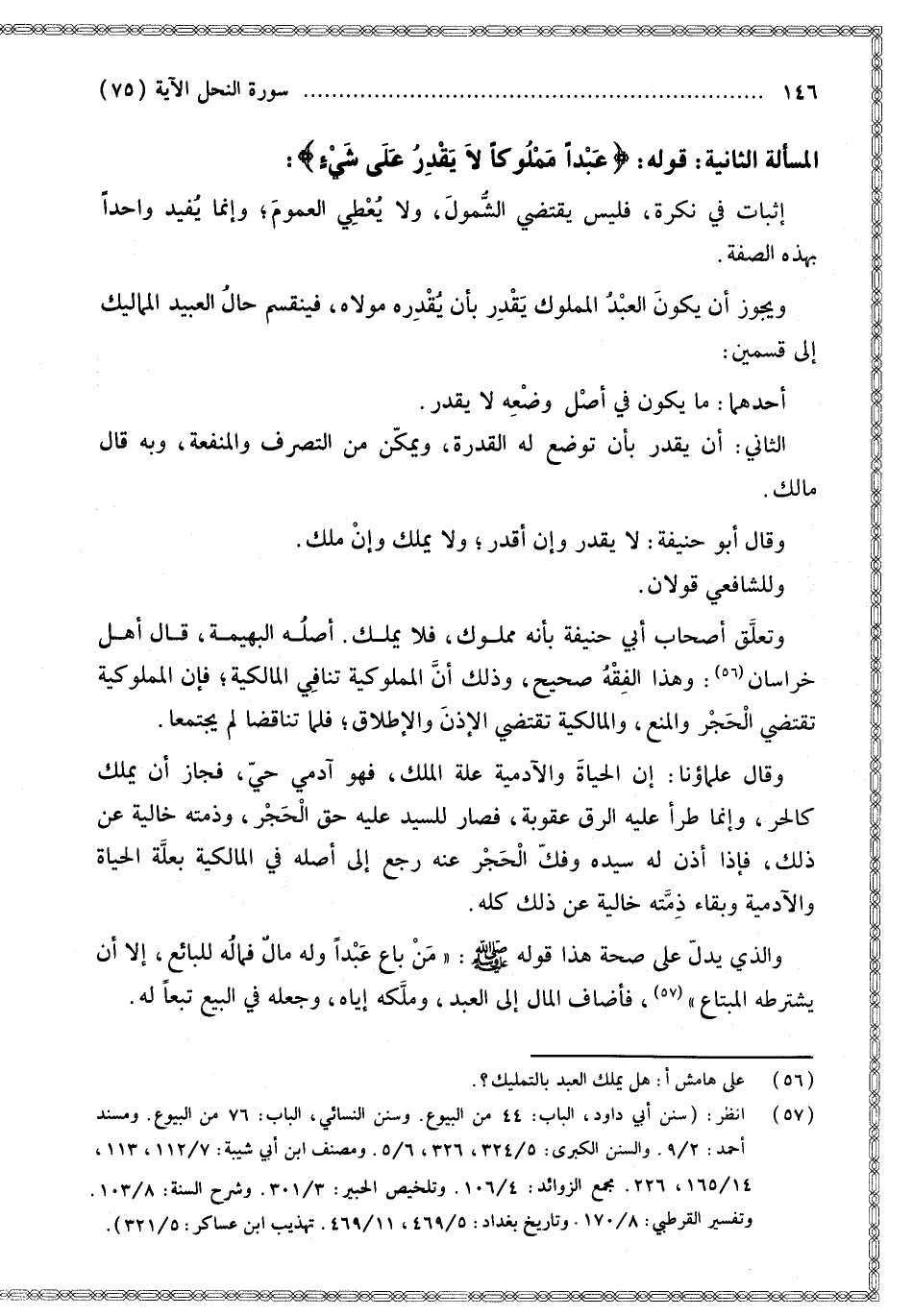 الْمَسْأَلَةُ الثَّانِيَةُ: قَوْلُهُ: {عَبْدًا مَمْلُوكًا لا يَقْدِرُ عَلَى شَيْءٍ} [النحل: 75]: إثْبَاتٌ فِي نَكِرَةٍ، فَلَيْسَ يَقْتَضِي الشُّمُولَ، وَلَا يُعْطِي الْعُمُومَ؛ وَإِنَّمَا يُفِيدُ وَاحِدًا بِهَذِهِ الصِّفَةِ. وَيَجُوزُ أَنْ يَكُونَ الْعَبْدُ الْمَمْلُوكُ يَقْدِرُ بِأَنْ يُقْدِرَهُ مَوْلَاهُ، فَيَنْقَسِمُ حَالُ الْعَبِيدِ الْمَمَالِيكِ إلَى قِسْمَيْنِ: