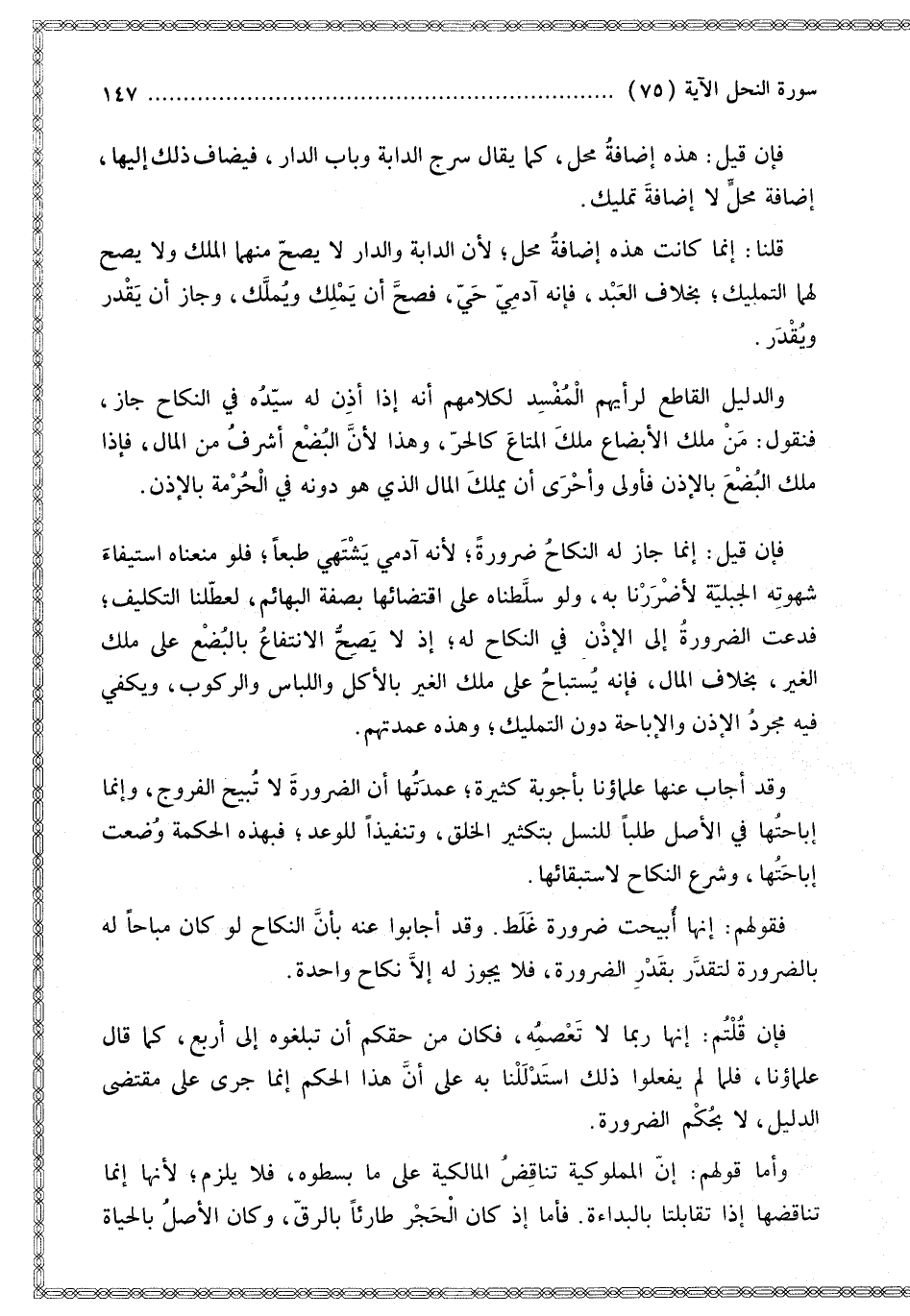 فَقَوْلُهُمْ: إنَّهَا أُبِيحَتْ ضَرُورَةً غَلَطٌ. وَقَدْ أَجَابُوا عَنْهُ بِأَنَّ النِّكَاحَ لَوْ كَانَ مُبَاحًا لَهُ بِالضَّرُورَةِ لَتَقَدَّرَ بِقَدْرِ الضَّرُورَةِ، فَلَا يَجُوزُ لَهُ إلَّا نِكَاحُ وَاحِدَةٍ. فَإِنْ قُلْتُمْ: إنَّهَا رُبَّمَا لَا تَعْصِمُهُ، فَكَانَ مِنْ حَقِّكُمْ أَنْ تُبَلِّغُوهُ إلَى أَرْبَعٍ، كَمَا قَالَ عُلَمَاؤُنَا، فَلَمَّا لَمْ يَفْعَلُوا ذَلِكَ اسْتَدْلَلْنَا بِهِ عَلَى أَنَّ هَذَا الْحُكْمَ إنَّمَا جَرَى عَلَى مُقْتَضَى الدَّلِيلِ، لَا بِحُكْمِ الضَّرُورَةِ. وَأَمَّا قَوْلُهُمْ: إنَّ الْمَمْلُوكِيَّةَ تُنَاقِضُ الْمَالِكِيَّةَ عَلَى مَا بَسَطُوهُ، فَلَا يَلْزَمُ؛ لِأَنَّهَا إنَّمَا تُنَاقِضُهَا إذَا تَقَابَلَتَا بِالْبُدَاءَةِ. فَأَمَّا إذْ كَانَ الْحَجْرُ طَارِئًا بِالرِّقِّ، وَكَانَ الْأَصْلُ بِالْحَيَاةِ