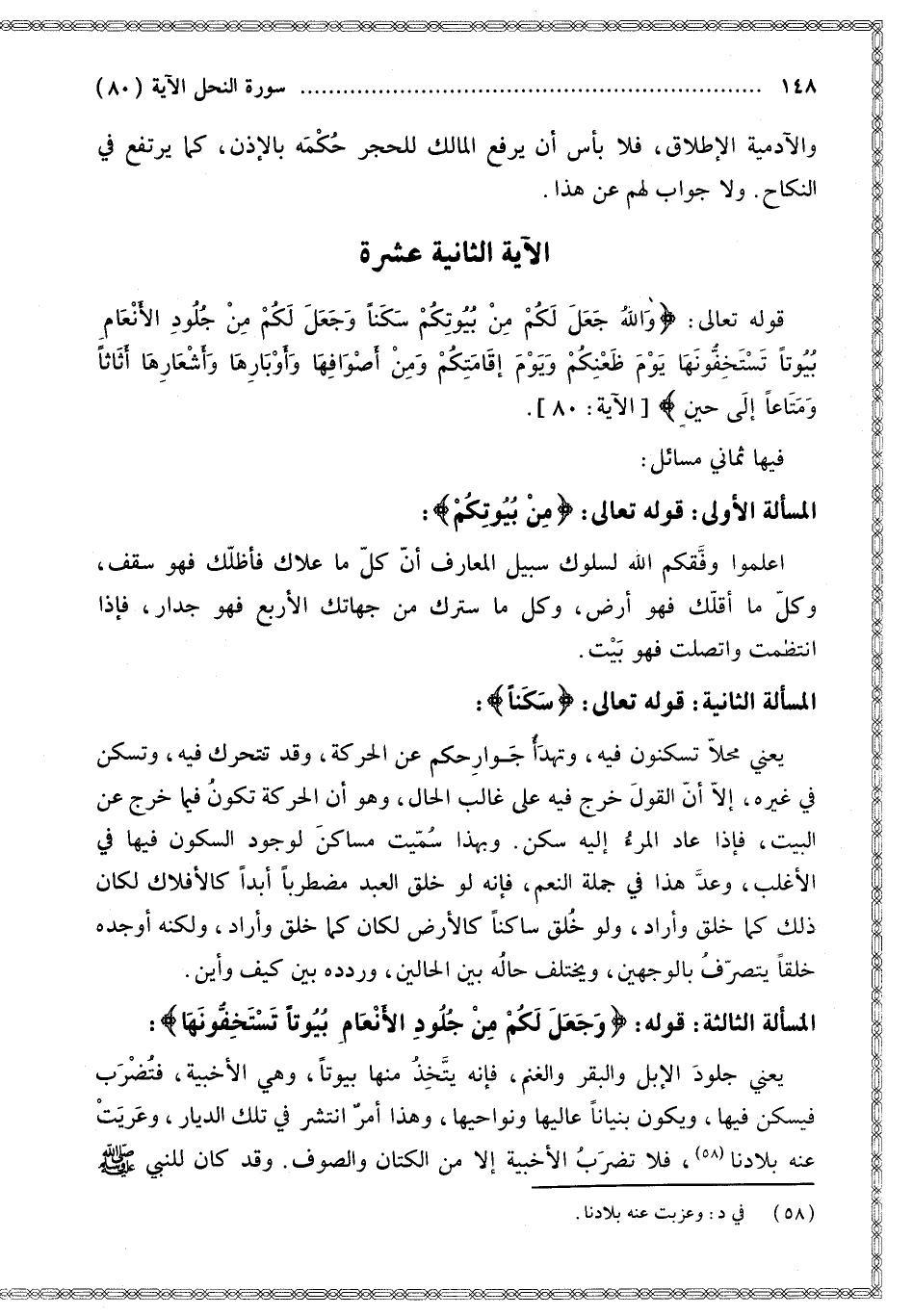 [الْآيَة الثَّانِيَة عَشْرَة قَوْله تَعَالَى وَاَللَّهُ جَعَلَ لَكُمْ مِنْ بُيُوتِكُمْ سَكَنًا]