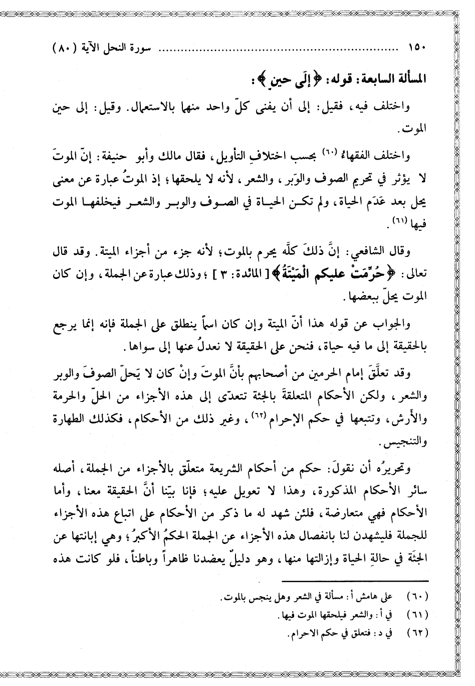 قَوْلُهُ: {إِلَى حِينٍ} [النحل: 80]: وَاخْتُلِفَ فِيهِ، فَقِيلَ: إلَى أَنْ يَفْنَى كُلُّ وَاحِدٍ مِنْهُمَا بِالِاسْتِعْمَالِ. وَقِيلَ: إلَى حِينِ الْمَوْتِ. وَاخْتَلَفَ الْفُقَهَاءُ بِحَسَبِ اخْتِلَافِ التَّأْوِيلِ، فَقَالَ مَالِكٌ وَأَبُو حَنِيفَةَ: إنَّ الْمَوْتَ لَا يُؤَثِّرُ فِي تَحْرِيمِ الصُّوفِ وَالْوَبَرِ، وَالشَّعْرِ؛ لِأَنَّهُ لَا يَلْحَقُهَا إذْ الْمَوْتُ عِبَارَةٌ عَنْ مَعْنًى يَحِلُّ بَعْدَ عَدَمِ الْحَيَاةِ، وَلَمْ تَكُنْ الْحَيَاةُ فِي الصُّوفِ وَالْوَبَرِ وَالشَّعْرِ فَيَخْلُفُهَا الْمَوْتُ فِيهَا. وَقَالَ الشَّافِعِيُّ: إنَّ ذَلِكَ كُلَّهُ يَحْرُمُ بِالْمَوْتِ؛ لِأَنَّهُ جُزْءٌ مِنْ أَجْزَاءِ الْمَيِّتَةِ. وَقَدْ قَالَ تَعَالَى: {حُرِّمَتْ عَلَيْكُمُ الْمَيْتَةُ} [المائدة: 3] وَذَلِكَ عِبَارَةٌ عَنْ الْجُمْلَةِ، وَإِنْ كَانَ الْمَوْتُ يَحِلُّ بِبَعْضِهَا. وَالْجَوَابُ عَنْ قَوْلِهِ هَذَا أَنَّ الْمَيْتَةَ وَإِنْ كَانَ اسْمًا يَنْطَلِقُ عَلَى الْجُمْلَةِ فَإِنَّهُ إنَّمَا يَرْجِعُ بِالْحَقِيقَةِ إلَى مَا فِيهِ حَيَاةٌ، فَنَحْنُ عَلَى الْحَقِيقَةِ لَا نَعْدِلُ عَنْهَا إلَى سِوَاهَا.