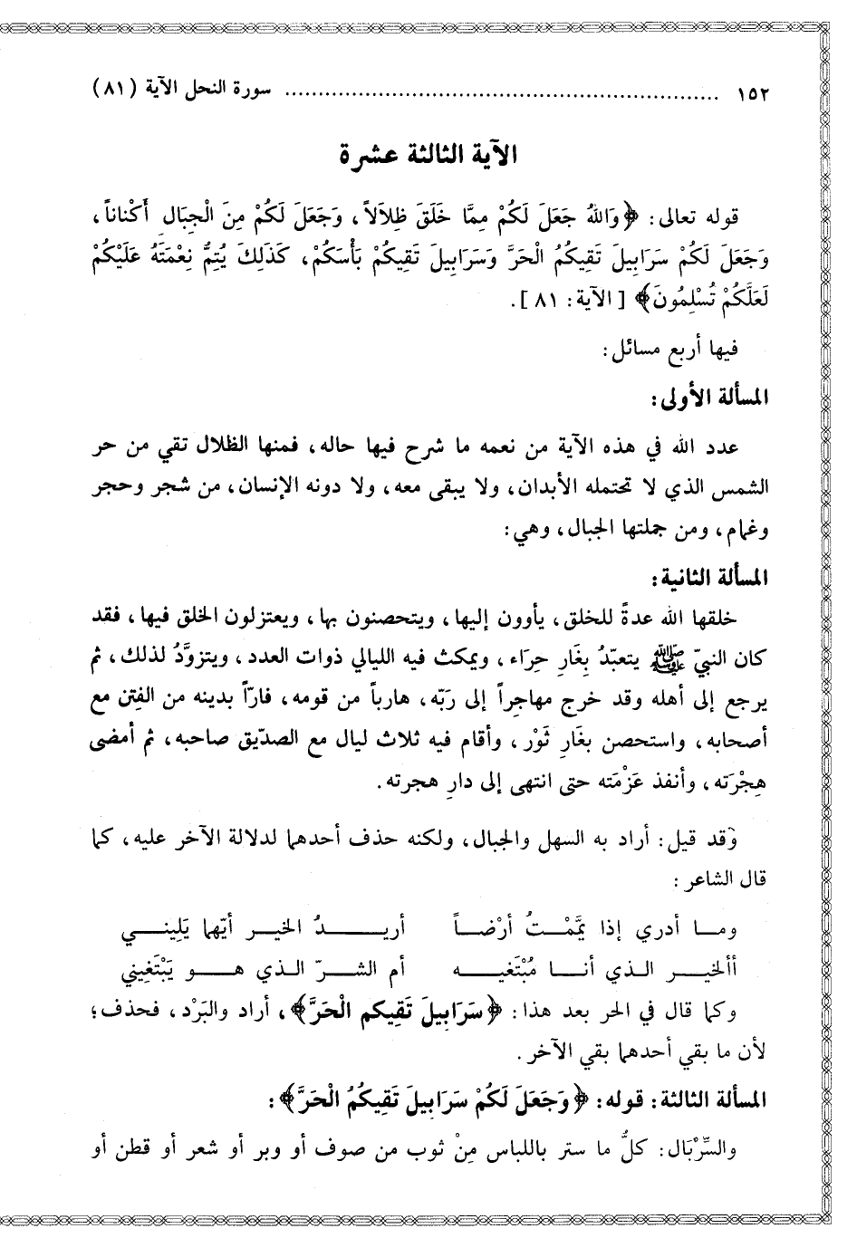 وَجَعَلَ لَكُمْ مِنَ الْجِبَالِ أَكْنَانًا وَجَعَلَ لَكُمْ سَرَابِيلَ تَقِيكُمُ الْحَرَّ وَسَرَابِيلَ تَقِيكُمْ بَأْسَكُمْ كَذَلِكَ يُتِمُّ نِعْمَتَهُ عَلَيْكُمْ لَعَلَّكُمْ تُسْلِمُونَ} [النحل: 81]. فِيهَا أَرْبَعُ مَسَائِلَ: