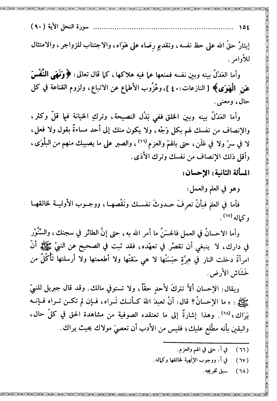 الْمَسْأَلَةُ الثَّانِيَةُ: الْإِحْسَانُ: وَهُوَ فِي الْعِلْمِ وَالْعَمَلِ: فَأَمَّا فِي الْعِلْمِ فَبِأَنْ تَعْرِفَ حُدُوثَ نَفْسِك وَنَقْصَهَا، وَوُجُوبَ الْأَوَّلِيَّةِ لِخَالِقِهَا وَكَمَالِهِ. وَأَمَّا الْإِحْسَانُ فِي الْعَمَلِ فَالْحَسَنُ مَا أَمَرَ اللَّهُ بِهِ، حَتَّى إنَّ الطَّائِرَ فِي سِجْنِك، وَالسِّنَّوْرَ فِي دَارِك، لَا يَنْبَغِي أَنْ تُقَصِّرَ فِي تَعَهُّدِهِ، فَقَدْ ثَبَتَ فِي الصَّحِيحِ عَنْ النَّبِيِّ - صَلَّى اللَّهُ عَلَيْهِ وَسَلَّمَ - «أَنَّ امْرَأَةً دَخَلَتْ النَّارَ فِي هِرَّةٍ حَبَسَتْهَا لَا هِيَ سَقَتْهَا وَلَا أَطْعَمَتْهَا وَلَا أَرْسَلَتْهَا تَأْكُلُ مِنْ خَشَاشِ الْأَرْضِ».