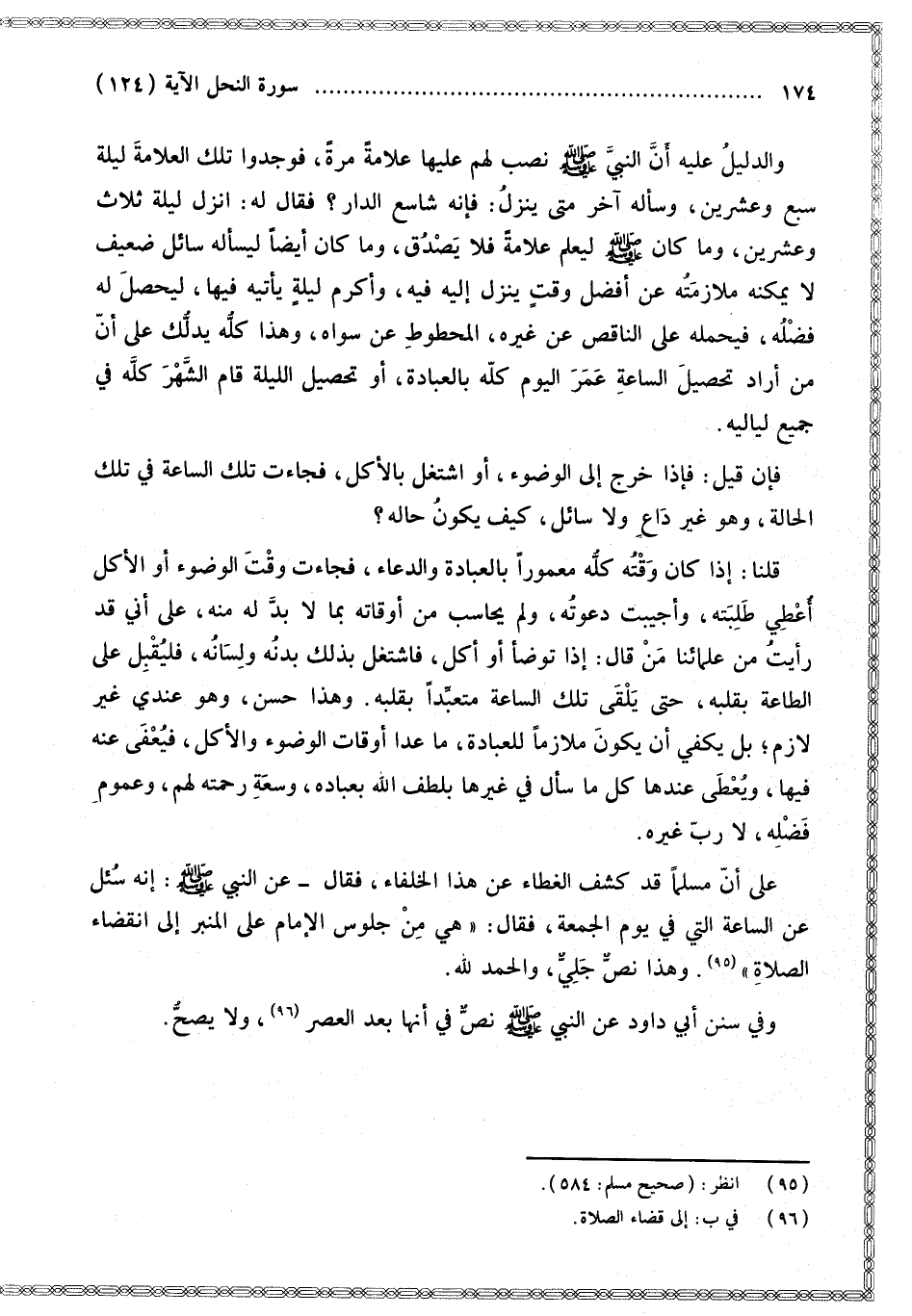 وَالدَّلِيلُ عَلَيْهِ أَنَّ النَّبِيَّ - صَلَّى اللَّهُ عَلَيْهِ وَسَلَّمَ - نَصَبَ لَهُمْ عَلَيْهَا عَلَامَةً مَرَّةً، فَوَجَدُوا تِلْكَ الْعَلَامَةَ لَيْلَةَ سَبْعٍ وَعِشْرِينَ، وَسَأَلَهُ آخَرُ مَتَى يَنْزِلُ: فَإِنَّهُ شَاسِعُ الدَّارِ؟ فَقَالَ لَهُ: انْزِلْ لَيْلَةَ ثَلَاثٍ وَعِشْرِينَ، وَمَا كَانَ - صَلَّى اللَّهُ عَلَيْهِ وَسَلَّمَ - لِيُعَلِّمَ عَلَامَةً فَلَا يَصْدُقُ، وَمَا كَانَ أَيْضًا لِيَسْأَلهُ سَائِلٌ ضَعِيفٌ لَا يُمْكِنُهُ مُلَازَمَتُهُ عَنْ أَفْضَلِ وَقْتٍ يَنْزِلُ إلَيْهِ فِيهِ، وَأَكْرَمِ لَيْلَةٍ يَأْتِيه فِيهَا، لِيَحْصُلَ لَهُ فَضْلُهُ، فَيَحْمِلُهُ عَلَى النَّاقِصِ عَنْ غَيْرِهِ، الْمَحْطُوطِ عَنْ سِوَاهُ، وَهَذَا كُلُّهُ يَدُلُّك عَلَى أَنَّ مَنْ أَرَادَ تَحْصِيلَ السَّاعَةِ عَمَرَ الْيَوْمَ كُلَّهُ بِالْعِبَادَةِ، أَوْ تَحْصِيلَ اللَّيْلَةِ قَامَ الشَّهْرَ كُلَّهُ فِي جَمِيعِ لَيَالِيِهِ.