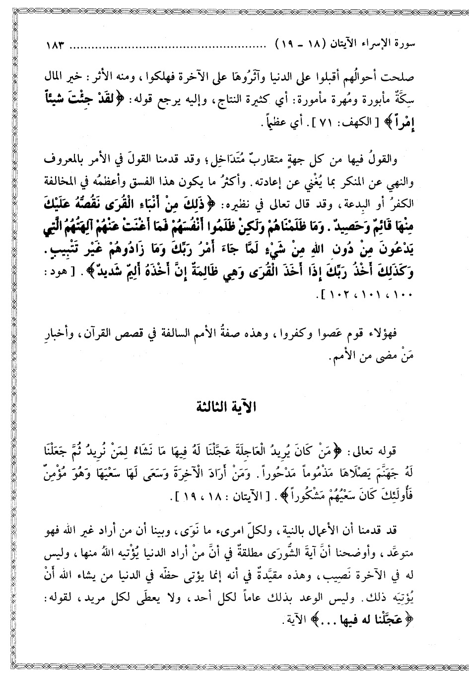 قَوْله تَعَالَى: {مَنْ كَانَ يُرِيدُ الْعَاجِلَةَ عَجَّلْنَا لَهُ فِيهَا مَا نَشَاءُ لِمَنْ نُرِيدُ ثُمَّ جَعَلْنَا لَهُ جَهَنَّمَ يَصْلاهَا مَذْمُومًا مَدْحُورًا} [الإسراء: 18] {وَمَنْ أَرَادَ الآخِرَةَ وَسَعَى لَهَا سَعْيَهَا وَهُوَ مُؤْمِنٌ فَأُولَئِكَ كَانَ سَعْيُهُمْ مَشْكُورًا} [الإسراء: 19] قَدْ قَدَّمْنَا أَنَّ الْأَعْمَالَ بِالنِّيَّةِ وَلِكُلِّ امْرِئٍ مَا نَوَى، وَبَيَّنَّا أَنَّ مَنْ أَرَادَ غَيْرَ اللَّهِ فَهُوَ مُتَوَعَّدٌ، وَأَوْضَحْنَا أَنَّ آيَةَ الشُّورَى مُطْلَقَةٌ فِي أَنَّ مَنْ أَرَادَ الدُّنْيَا يُؤْتِيهِ اللَّهُ مِنْهَا، وَلَيْسَ لَهُ فِي الْآخِرَةِ نَصِيبٌ وَهَذِهِ مُقَيَّدَةٌ فِي أَنَّهُ إنَّمَا يُؤْتَى حَقَّهُ فِي الدُّنْيَا مَنْ يَشَاءُ اللَّهُ أَنْ يُؤْتِيَهُ ذَلِكَ.