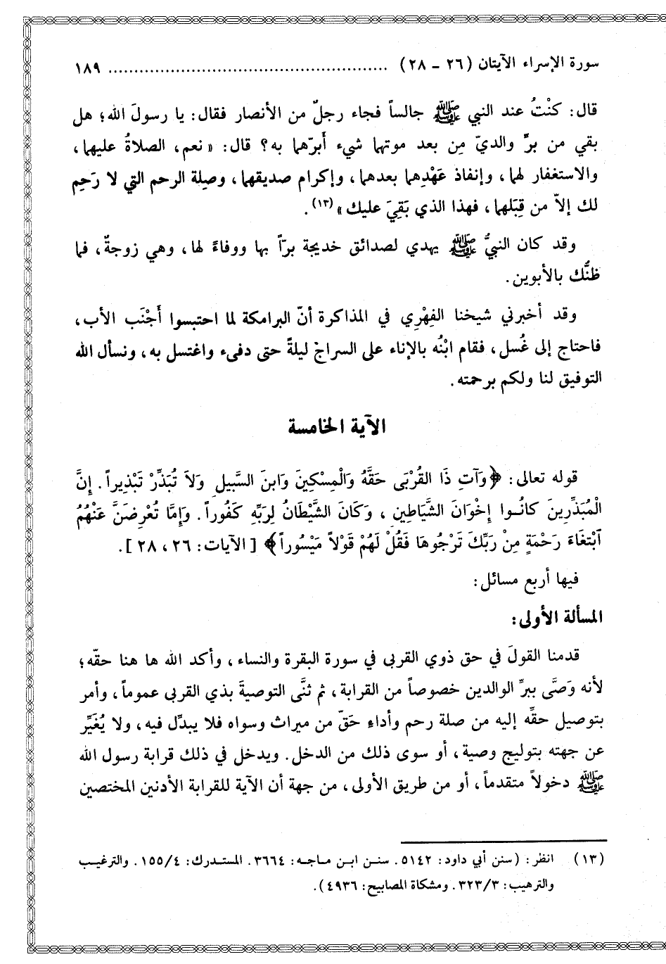 [الْآيَة الْخَامِسَة قَوْله تَعَالَى وَآتِ ذَا الْقُرْبَى حَقَّهُ وَالْمِسْكِينَ وَابْنَ السَّبِيلِ وَلَا تُبَذِّرْ تَبْذِيرًا]
