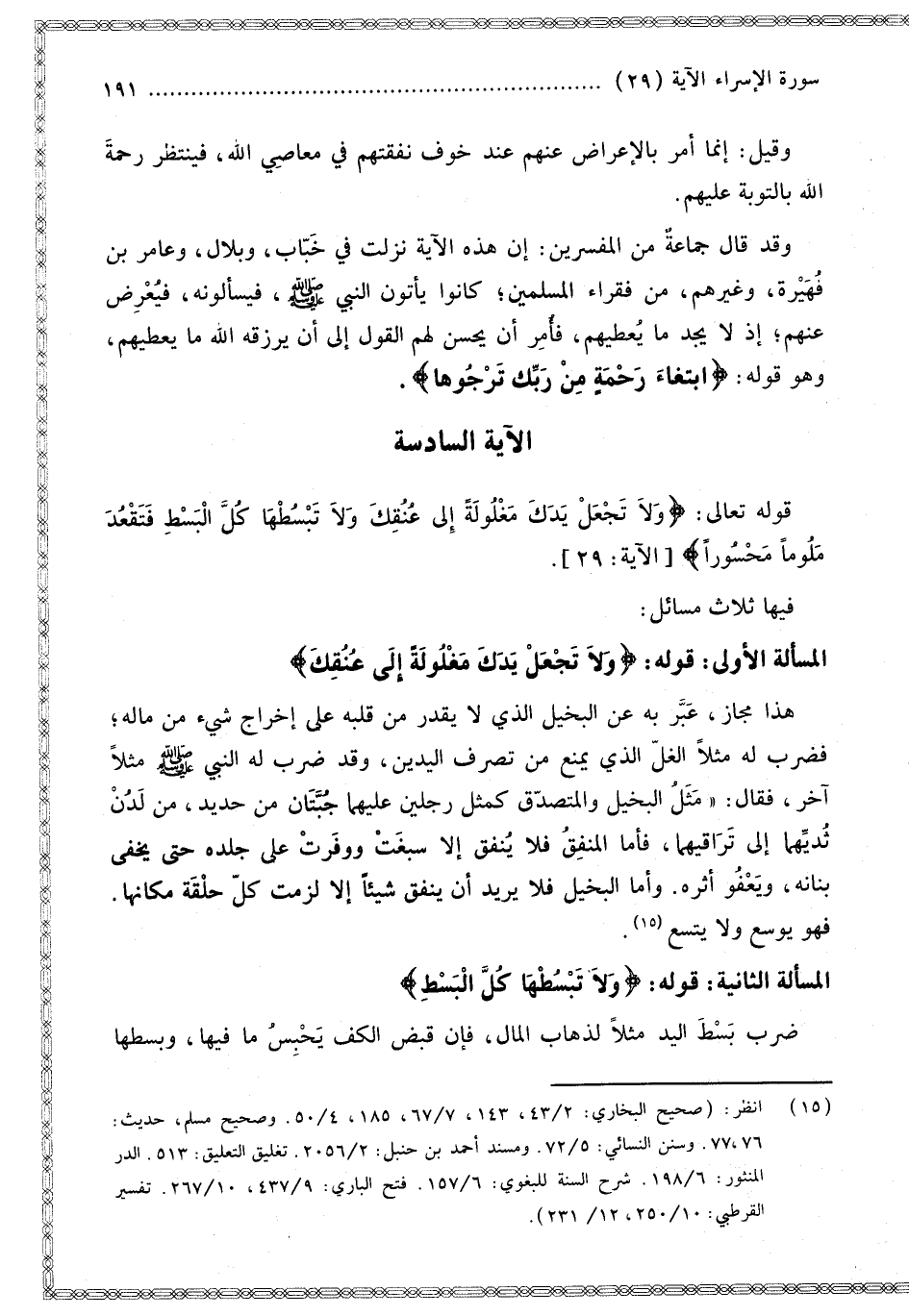 ِ فَتَقْعُدَ مَلُومًا مَحْسُورًا} [الإسراء: 29] فِيهَا ثَلَاثُ مَسَائِلَ: