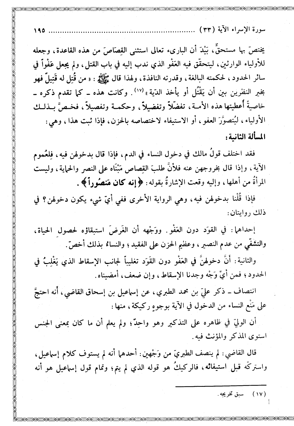 الْمَسْأَلَةُ الثَّانِيَةُ: فَقَدْ اخْتَلَفَ قَوْلُ مَالِكٍ فِي دُخُولِ النِّسَاءِ فِي الدَّمِ، فَإِذَا قَالَ بِدُخُولِهِنَّ فِيهِ، فَلِعُمُومِ الْآيَةِ، وَإِذَا قَالَ بِخُرُوجِهِنَّ عَنْهُ فَلِأَنَّ طَلَبَ الْقِصَاصِ مَبْنَاهُ عَلَى النَّصْرِ وَالْحِمَايَةِ، وَلَيْسَتْ الْمَرْأَةُ مِنْ أَهْلِهَا، وَإِلَيْهِ وَقَعَتْ الْإِشَارَةُ بِقَوْلِهِ: {إِنَّهُ كَانَ مَنْصُورًا} [الإسراء: 33]. فَإِذَا قُلْنَا بِدُخُولِهِنَّ فِيهِ، وَهِيَ الرِّوَايَةُ الْأُخْرَى فَفِي أَيِّ شَيْءٍ يَكُونُ دُخُولُهُنَّ؟ فِي ذَلِكَ رِوَايَتَانِ: