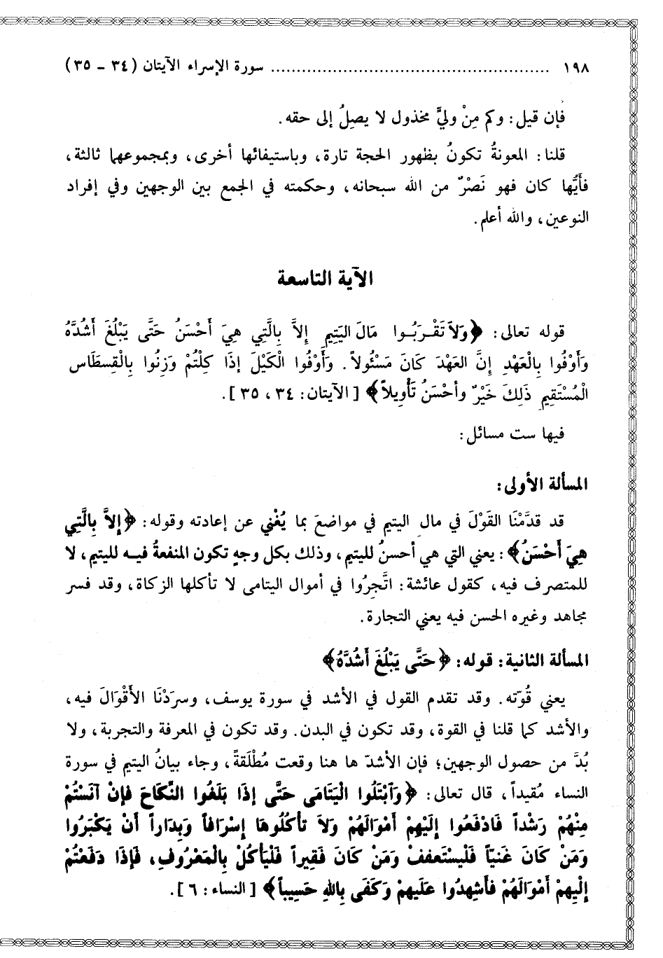 ُ حَتَّى يَبْلُغَ أَشُدَّهُ وَأَوْفُوا بِالْعَهْدِ إِنَّ الْعَهْدَ كَانَ مَسْئُولا} [الإسراء: 34] {وَأَوْفُوا الْكَيْلَ إِذَا كِلْتُمْ وَزِنُوا بِالْقِسْطَاسِ الْمُسْتَقِيمِ ذَلِكَ خَيْرٌ وَأَحْسَنُ تَأْوِيلا} [الإسراء: 35] فِيهَا سِتُّ مَسَائِلَ: