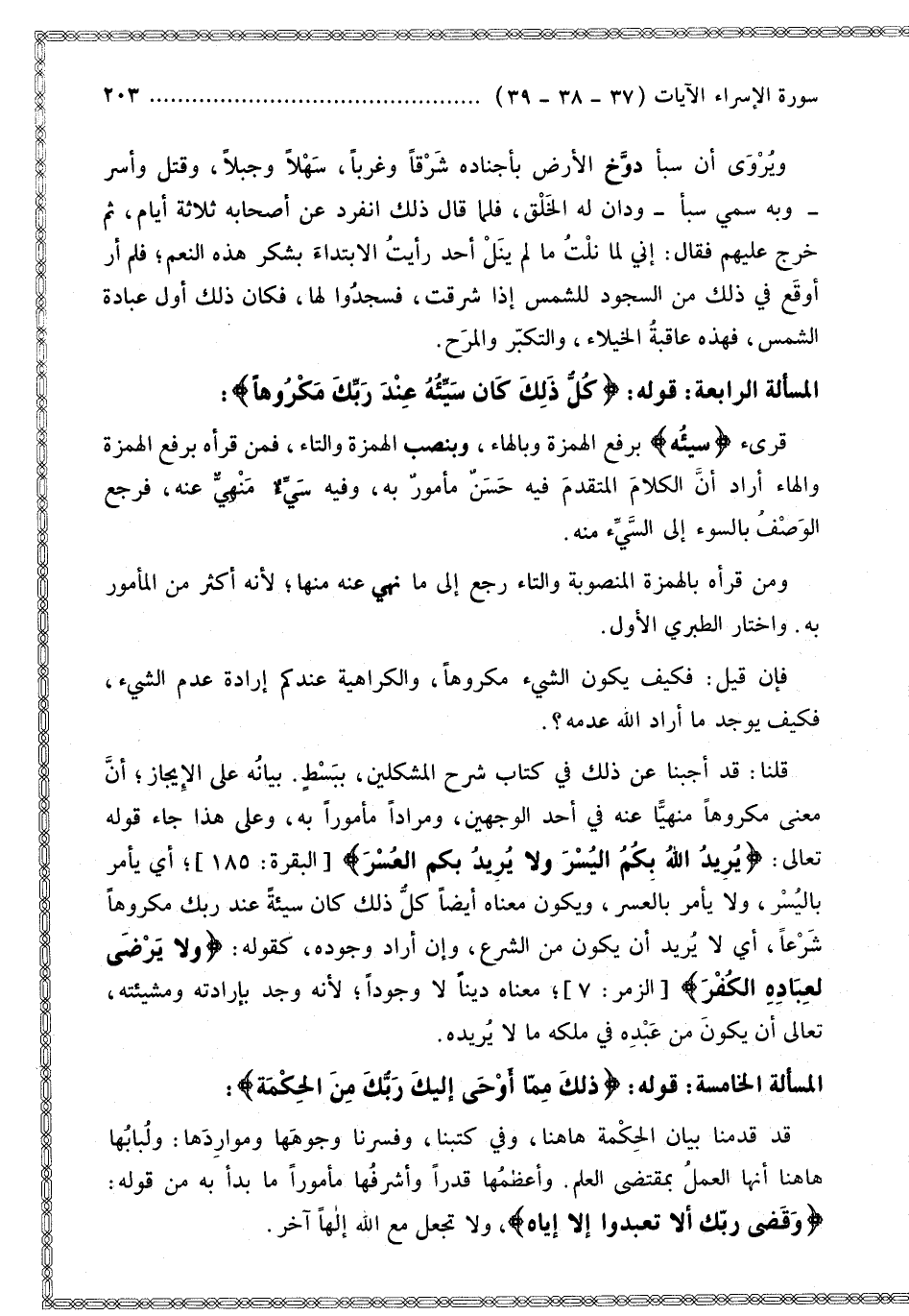 الْمَسْأَلَةُ الرَّابِعَةُ: قَوْلُهُ: {كُلُّ ذَلِكَ كَانَ سَيِّئُهُ عِنْدَ رَبِّكَ مَكْرُوهًا} [الإسراء: 38]: قُرِئَ {سَيِّئُهُ} [الإسراء: 38] بِرَفْعِ الْهَمْزَةِ وَبِالْهَاءِ، وَبِنَصَبِ الْهَمْزَةِ وَالتَّاءِ، فَمَنْ قَرَأَهُ بِرَفْعِ الْهَمْزَةِ وَالْهَاءِ أَرَادَ أَنَّ الْكَلَامَ الْمُتَقَدِّمَ فِيهِ حُسْنٌ مَأْمُورٌ بِهِ، وَفِيهِ سَيِّئٌ مَنْهِيٌّ عَنْهُ، فَرَجَعَ الْوَصْفُ بِالسُّوءِ إلَى السِّيءِ مِنْهُ. وَمَنْ قَرَأَهُ بِالْهَمْزَةِ الْمَنْصُوبَةِ وَالتَّاءِ رَجَعَ إلَى مَا نُهِيَ عَنْهُ مِنْهَا؛ لِأَنَّهُ أَكْثَرُ مِنْ الْمَأْمُورِ بِهِ. وَاخْتَارَ الطَّبَرِيُّ الْأَوَّلَ.