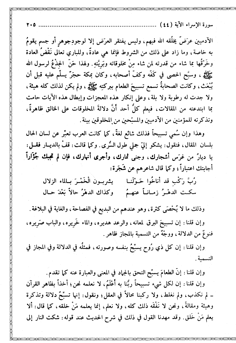 وَلِهَذَا حَنَّ الْجِذْعُ لِرَسُولِ اللَّهِ - صَلَّى اللَّهُ عَلَيْهِ وَسَلَّمَ - وَسَبَّحَ الْحَصَى فِي كَفِّهِ وَكَفِّ أَصْحَابِهِ، وَكَانَ بِمَكَّةَ حَجَرٌ يُسَلِّمُ عَلَيْهِ قَبْلَ أَنْ يُبْعَثَ، وَكَانَتْ الصَّحَابَةُ تَسْمَعُ تَسْبِيحَ الطَّعَامَ بِبَرَكَتِهِ - صَلَّى اللَّهُ عَلَيْهِ وَسَلَّمَ - وَلَمْ يَكُنْ لِذَلِكَ كُلُّهُ هَيْئَةٌ، وَلَا وُجِدَتْ لَهُ رُطُوبَةٌ وَلَا بَلَّةٌ، وَعَلَى إنْكَارِ هَذِهِ الْمُعْجِزَاتِ وَإِبْطَالِ هَذِهِ الْآيَاتِ حَامَتْ بِمَا ابْتَدَعَتْهُ مِنْ الْمَقَالَاتِ، فَيَعْلَمُ كُلُّ أَحَدٍ أَنَّ دَلَالَةَ الْمَخْلُوقَاتِ عَلَى الْخَالِقِ ظَاهِرَةٌ، وَتَذْكِرَتُهُ لِلْمُؤْمِنِينَ مِنْ الْآدَمِيِّينَ وَالْمُسَبِّحِينَ مِنْ الْمَخْلُوقِينَ بَيِّنَةٌ. وَهَذَا وَإِنْ سُمِّيَ تَسْبِيحًا فَذَلِكَ شَائِعٌ لُغَةً، كَمَا كَانَتْ الْعَرَبُ تُعَبِّرُ عَنْ لِسَانِ الْحَالِ بِلِسَانِ الْمَقَالِ، فَتَقُولُ: يَشْكُو إلَيَّ جَمَلِي طُولَ السُّرَى. وَكَمَا قَالَتْ: قِفْ بِالدِّيَارِ فَقُلْ: يَا دِيَارُ مَنْ غَرَسَ أَشْجَارَك، وَجَنَى ثِمَارَك، وَأَجْرَى أَنْهَارَك، فَإِنْ لَمْ تُجِبْك جُؤَارًا أَجَابَتْك اعْتِبَارًا؛ وَكَمَا قَالَ شَاعِرُهُمْ عَنْ شَجَرَةٍ: